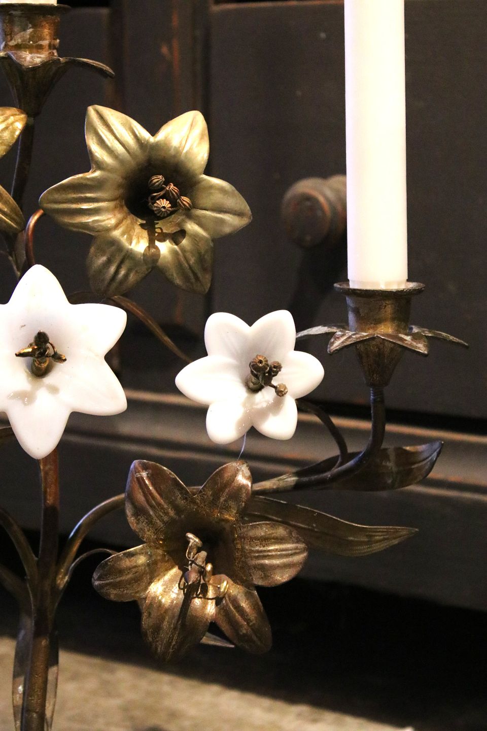 Old French church candlestick in bronze, decorated with bronze lilies and 3 old white opaline glass lilies.