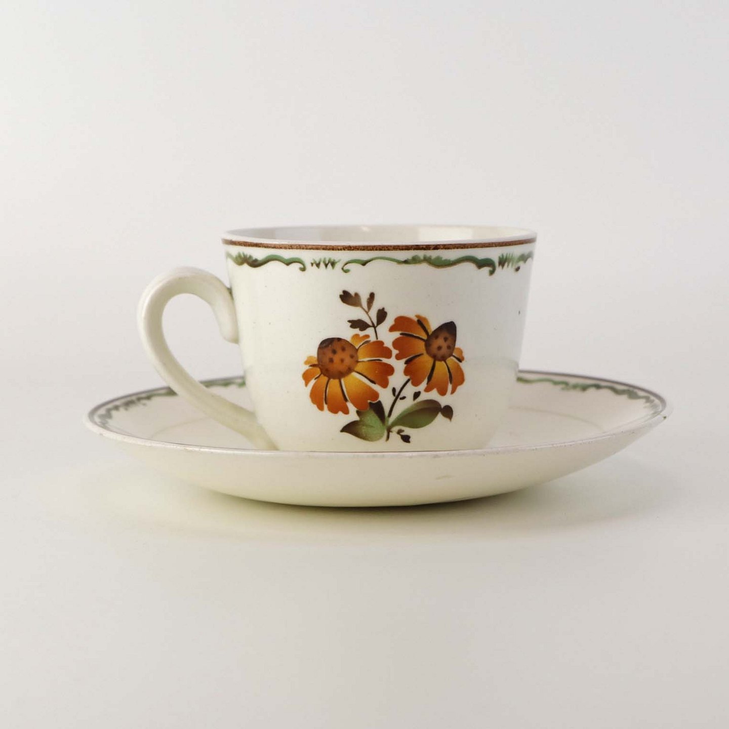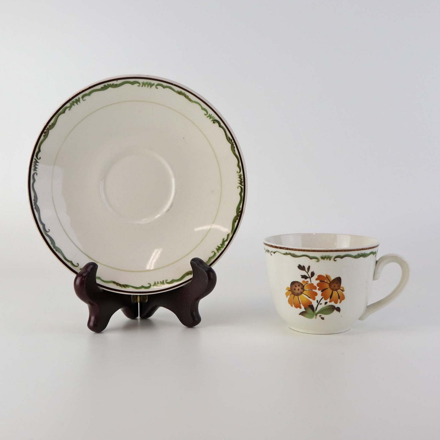 Kaffekop med underkop i fajance fra stellet Solbrud fremstillet i perioden 1937-1967. Nr. 2049
