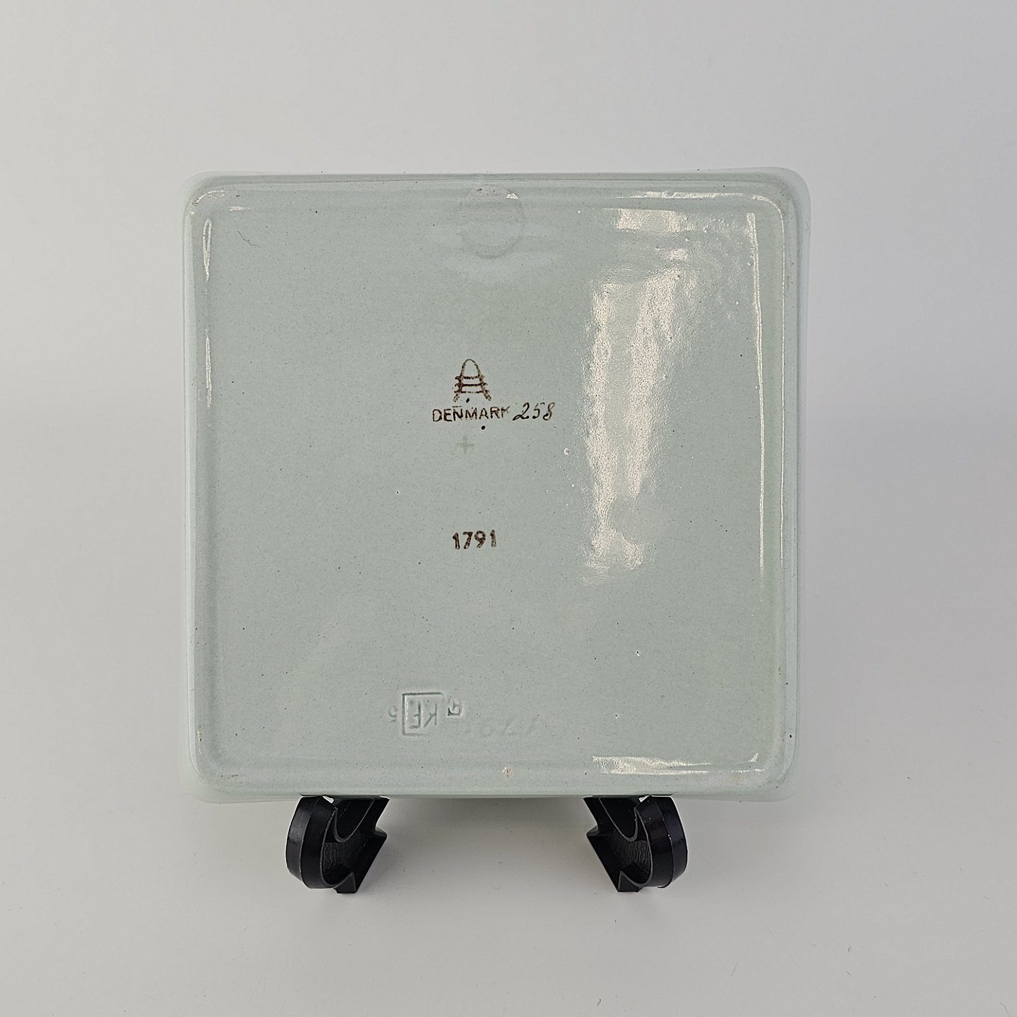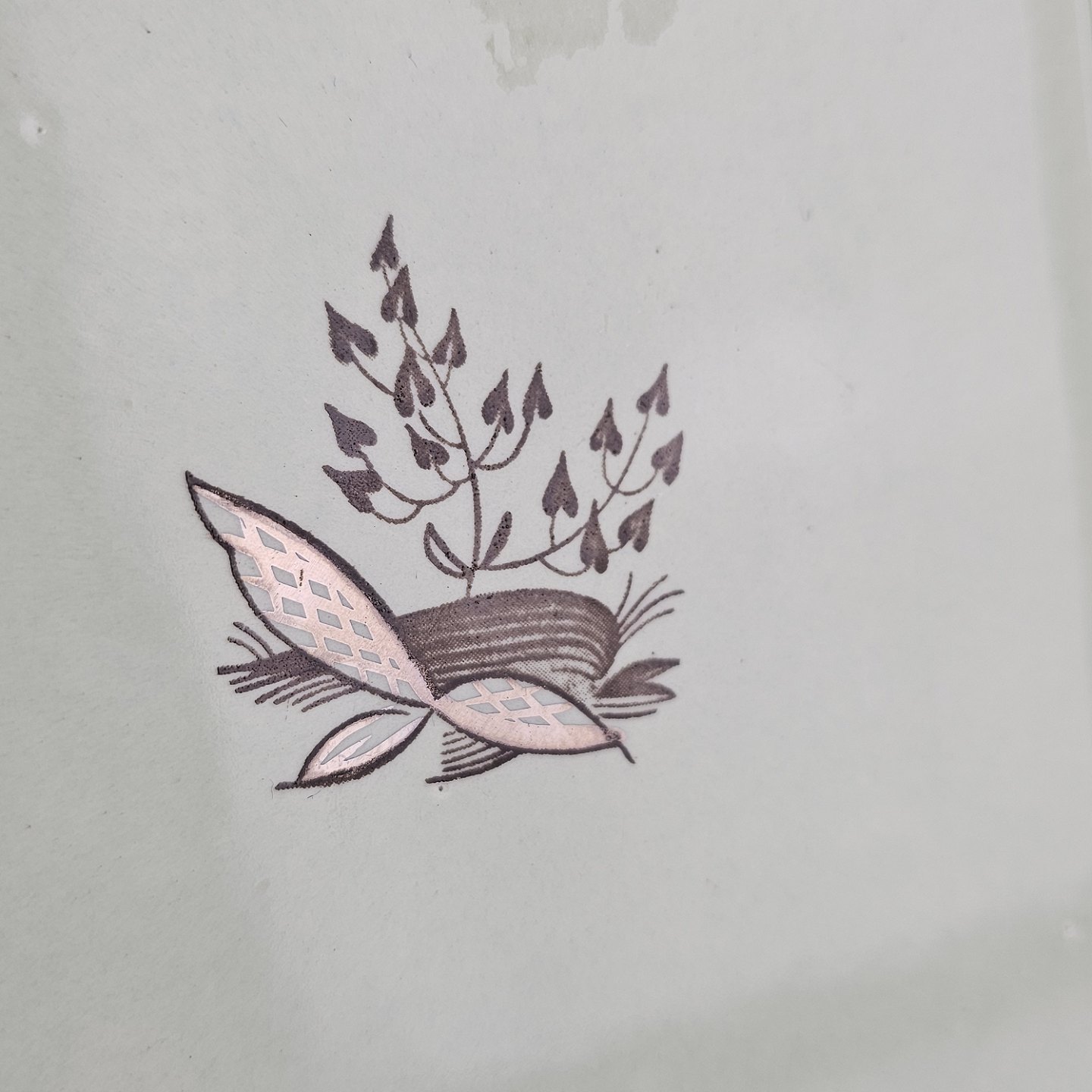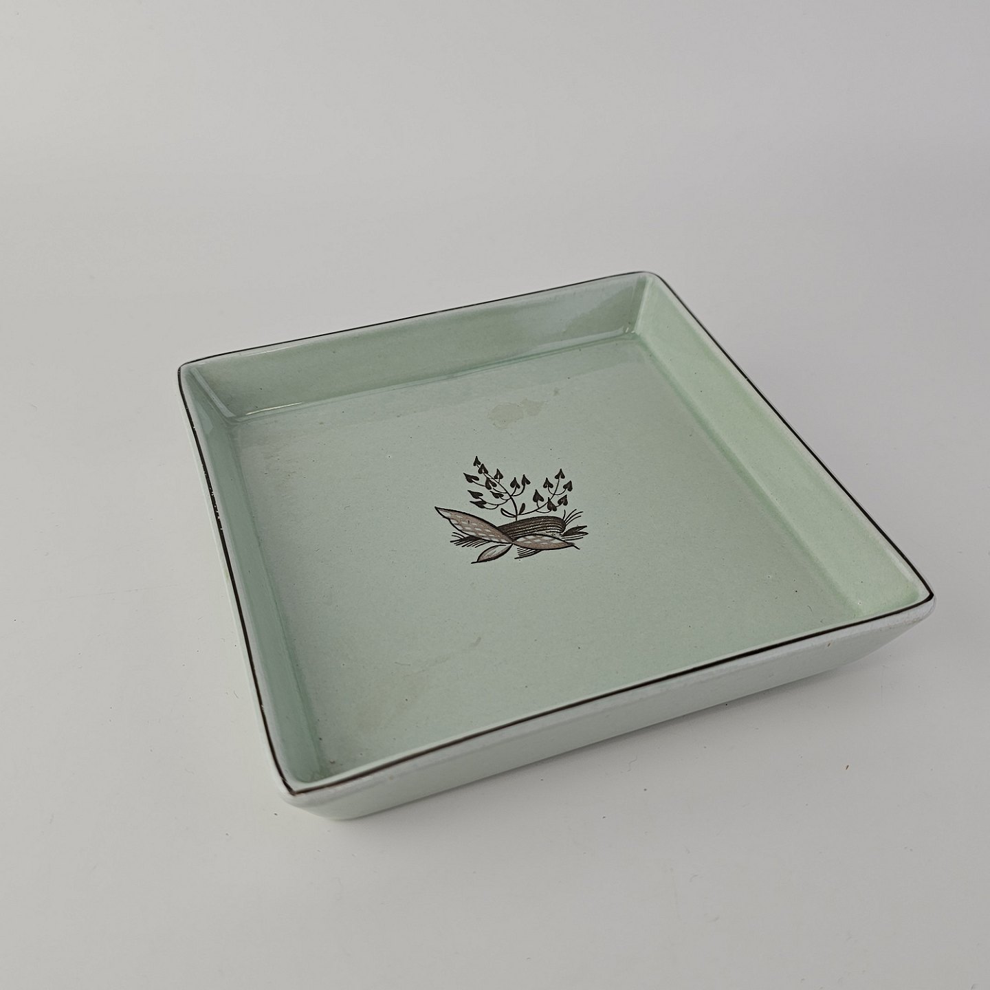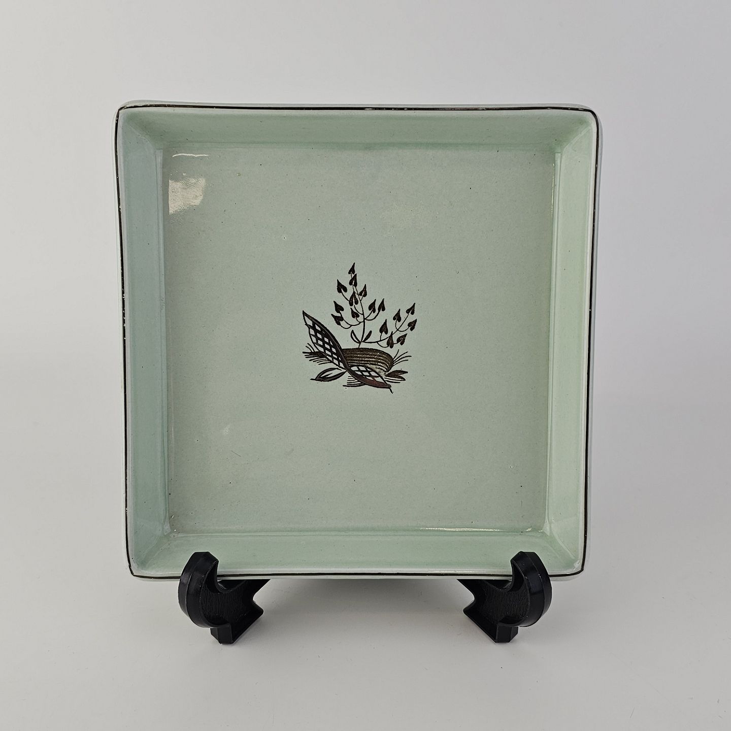 Stel i lysegrøn fajance med natur dekoration og flettet kant