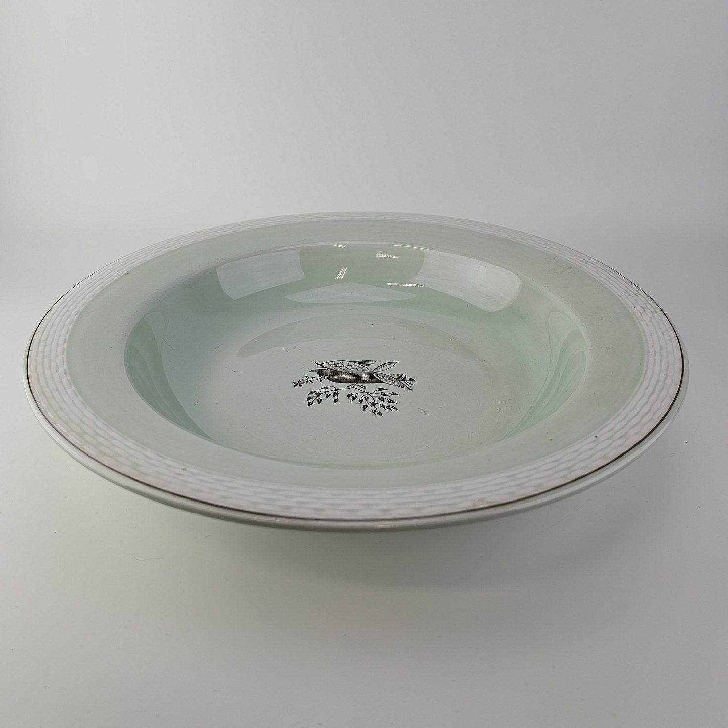 Stel i lysegrøn fajance med natur dekoration og flettet kant