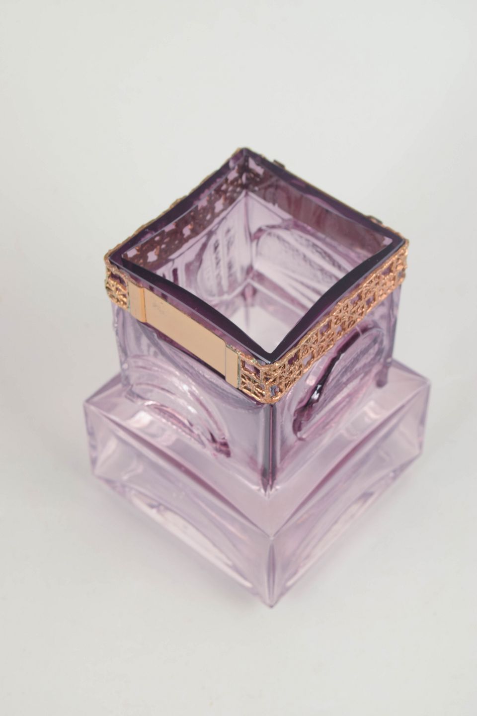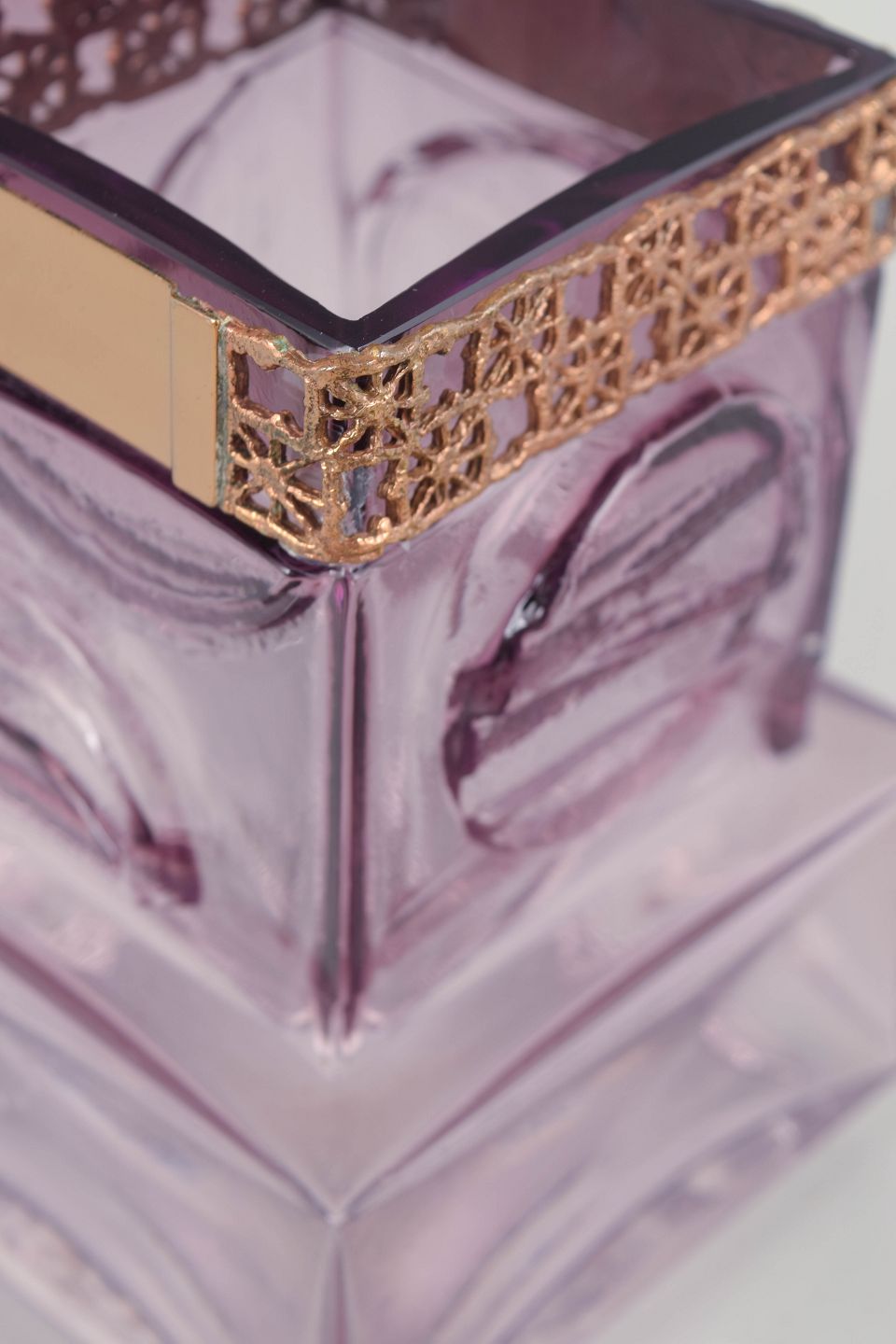 Sculptural vase in light purple mouth-blown art glass with a strong geometric form and a decorative metal gallery at the rim. The design combines a solid, faceted glass structure with an intricate pierced metal band, creating a striking contrast between weight and refinement.