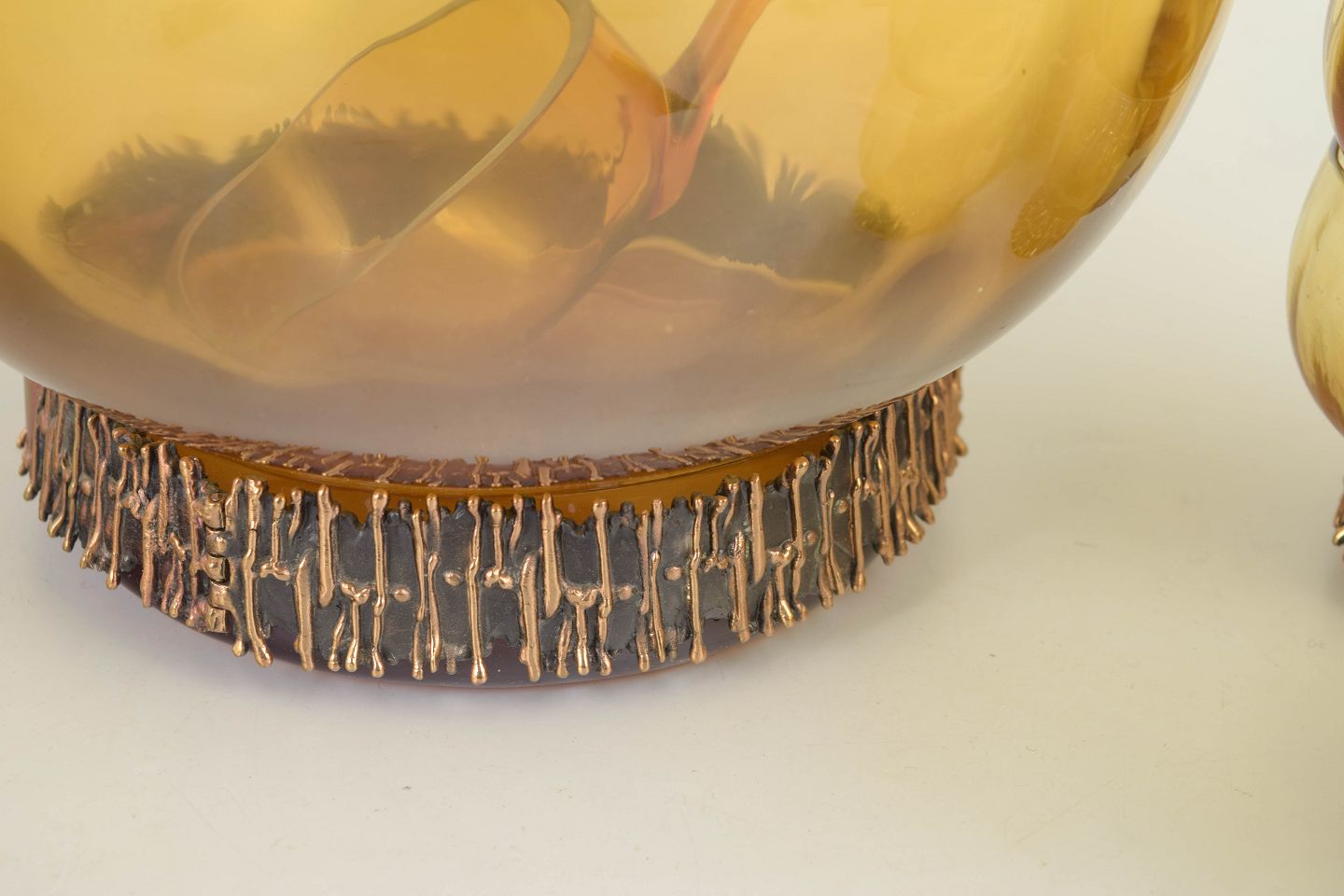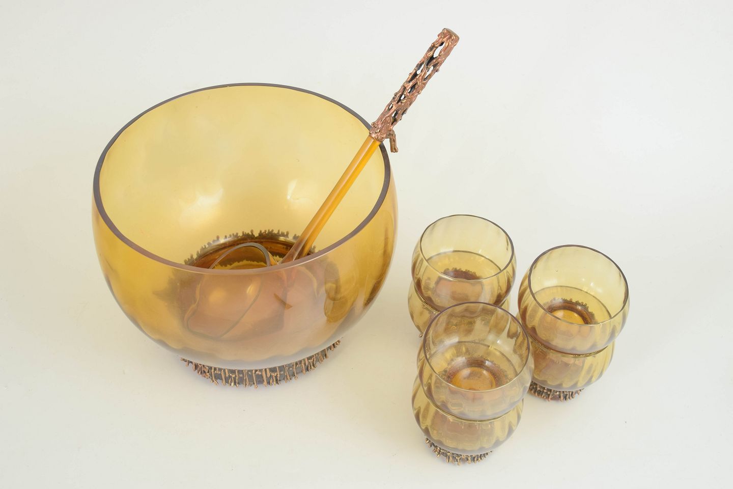 Punch bowl set in amber-toned mouth-blown art glass with a distinctive metal base, comprising a large punch bowl, 6 glasses, and a matching ladle. The sculptural design is defined by the contrast between the warm glass and the raw, textured metal foot.