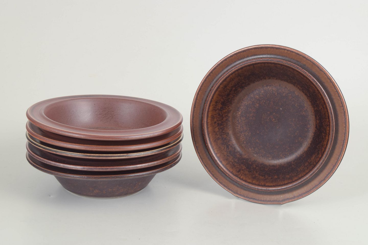 Sæt bestående af seks dybe tallerkener i stentøj fra Ruska-serien hos Arabia, udført med den karakteristiske, melerede brune glasur i varme jordtoner. Funktionel, rund form med let markeret fane og dyb kumme, velegnet til supper og pastaretter. Glasuren varierer naturligt og giver hvert stykke et individuelt udtryk.