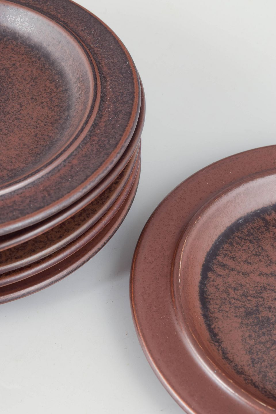 Sæt bestående af seks tallerkener i stentøj fra Ruska-serien hos Arabia, udført med den karakteristiske, melerede brune glasur i varme jordtoner. Klassisk cirkulær form med let forhøjet fane og levende glasuroverflade, hvor naturlige variationer giver hvert stykke et individuelt udtryk.
