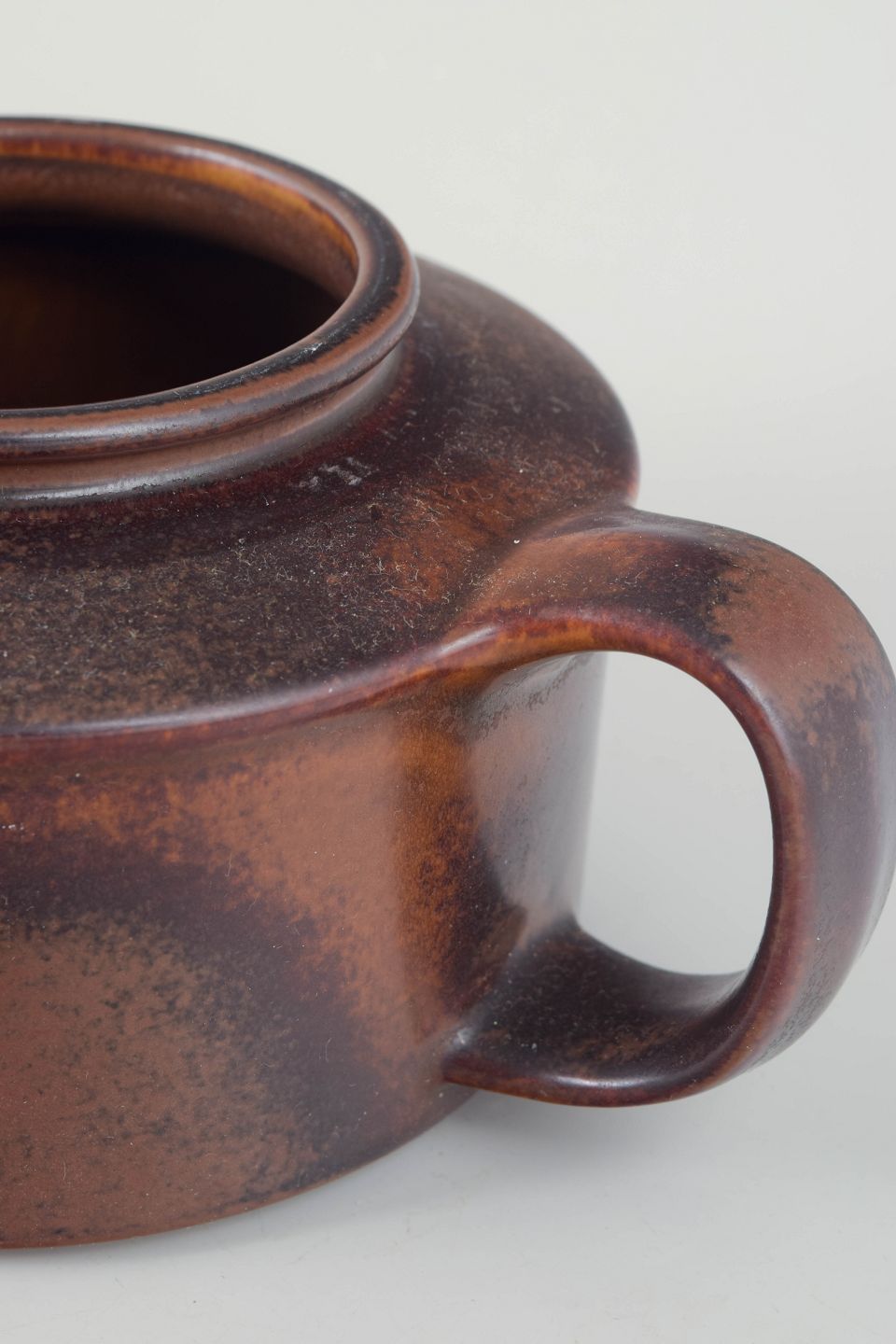 Kompakt tekande i stentøj fra Arabia, udført i serien Ruska med karakteristisk, meleret brun glasur i varme jordtoner. Lav, cylindrisk form med integreret tud, bred hank og fladt låg med ringgreb.