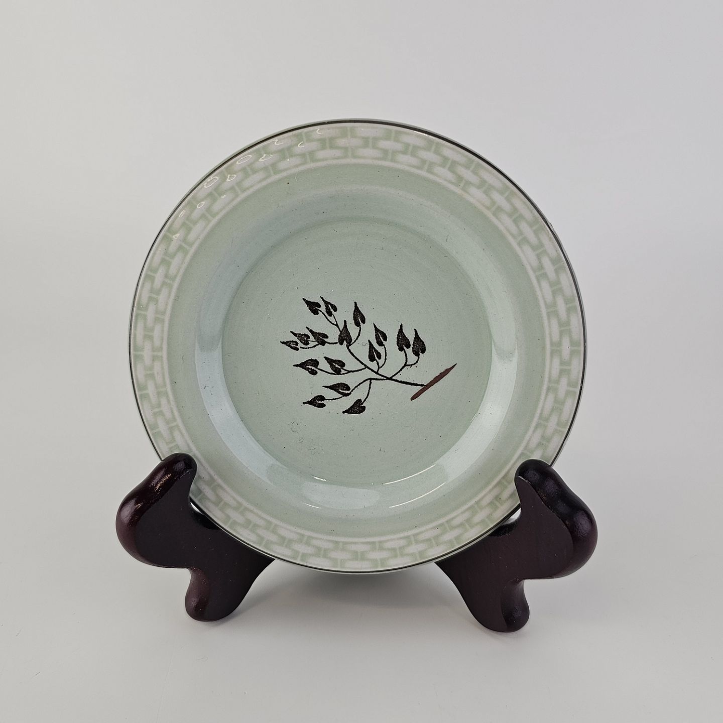 Stel i lysegrøn fajance med natur dekoration og flettet kant