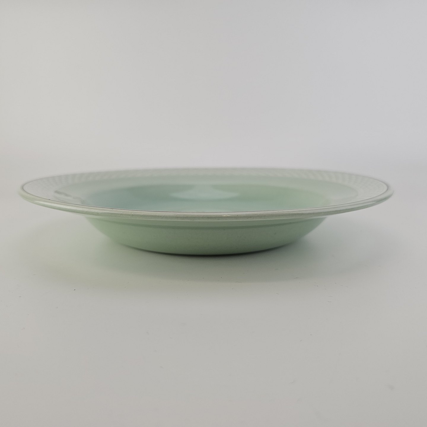 Stel i lysegrøn fajance med natur dekoration og flettet kant