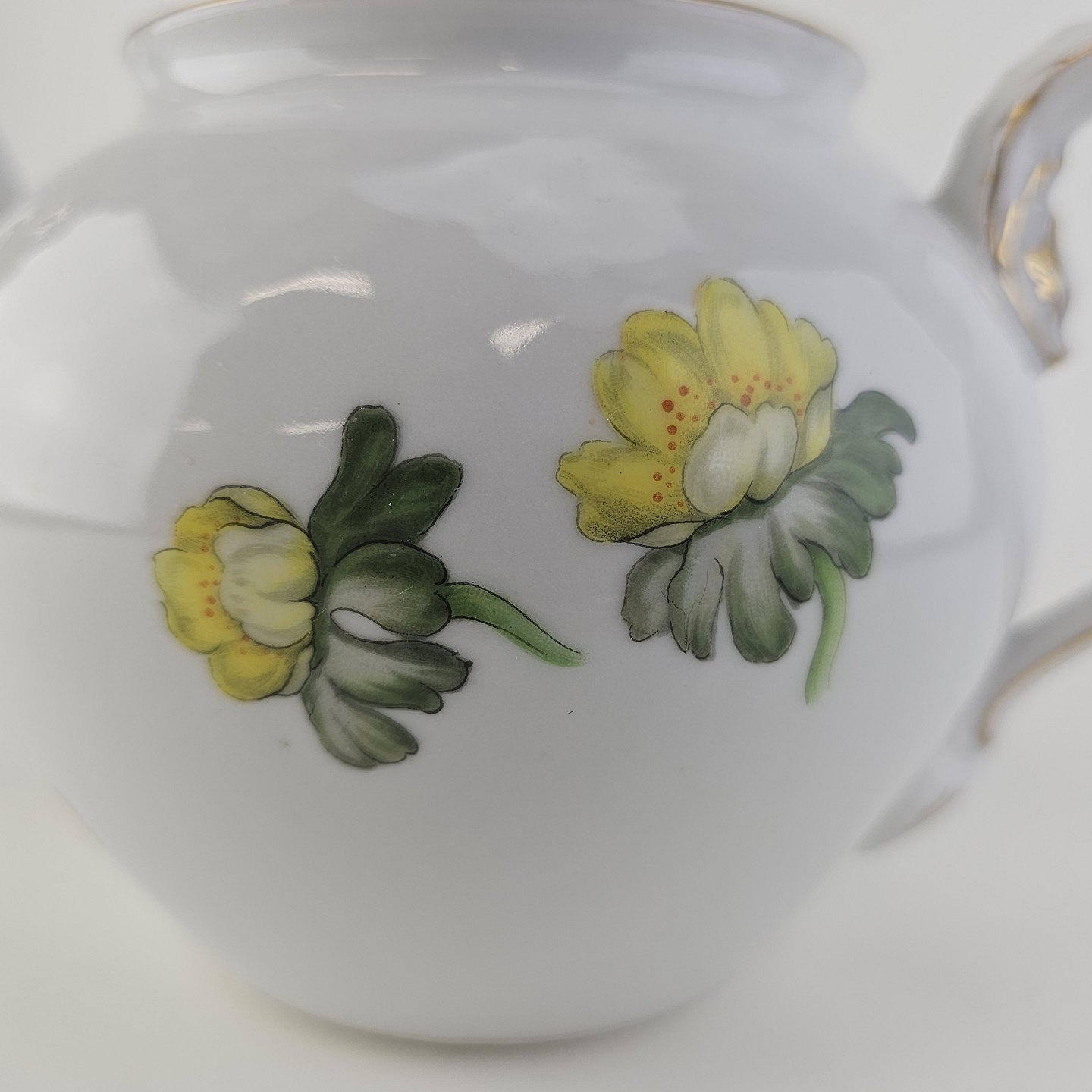 Hvidt porcelæn i skælform med dekoration af gule blomster og guldkant