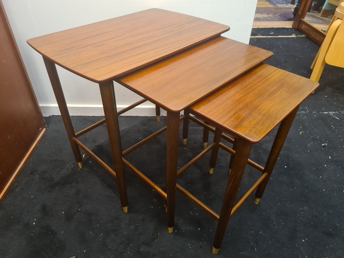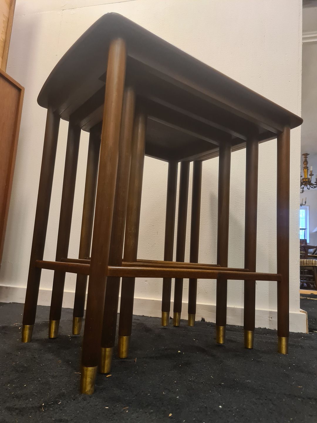 Dansk Design indskudsborde fra 1970'erne i mahogni og med messing sko. Fremstår pæne og velholdte uden nævneværdige brugsspor.