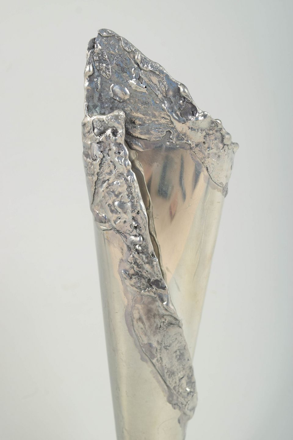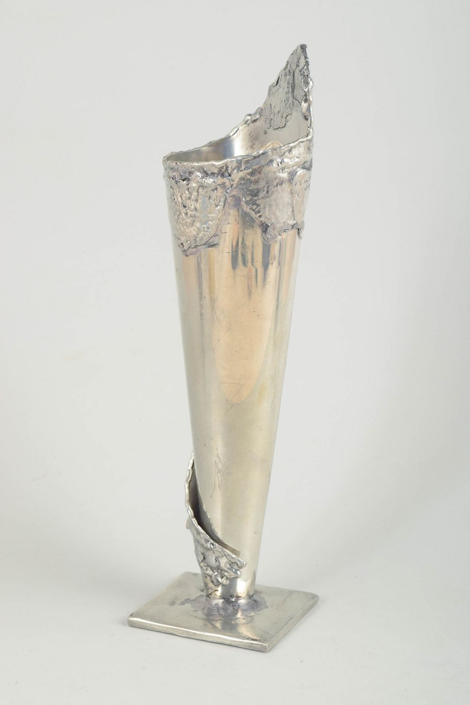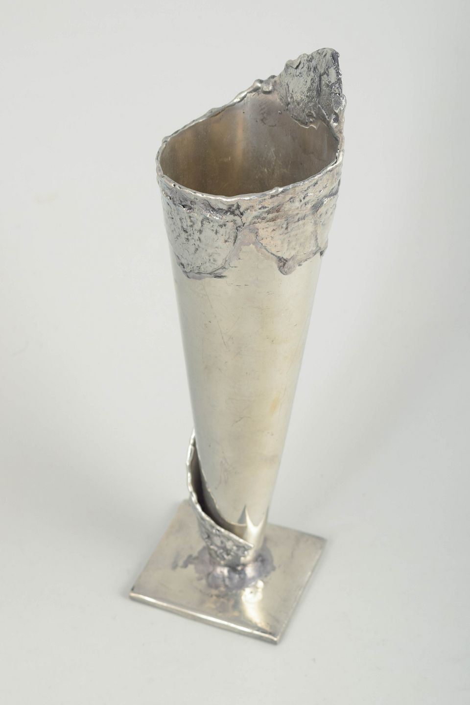 Skulpturelt udformet vase i tin med høj, konisk krop og rå, organisk kant med struktureret overflade. Monteret på kvadratisk fod.