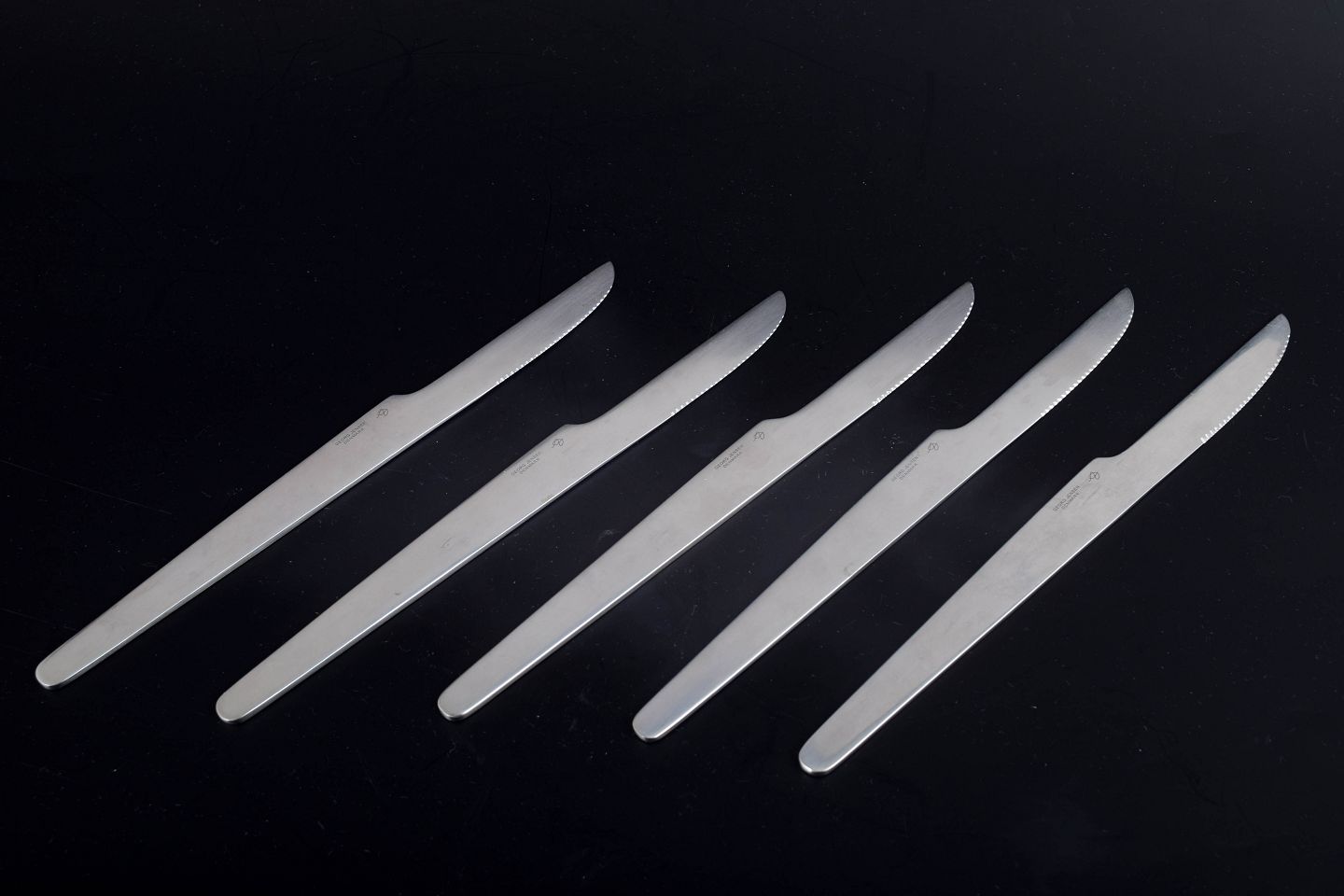 Sæt bestående af fem middagsknive i rustfrit stål. Knivene er udført i et stramt og funktionelt formsprog karakteristisk for Arne Jacobsens bestikdesign og produceret af Georg Jensen. Modellen er fra 1980’erne.
