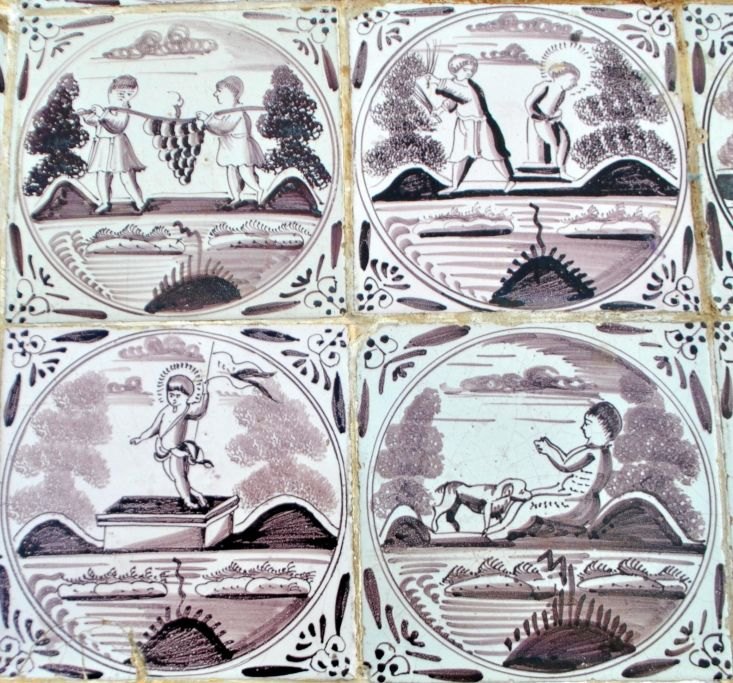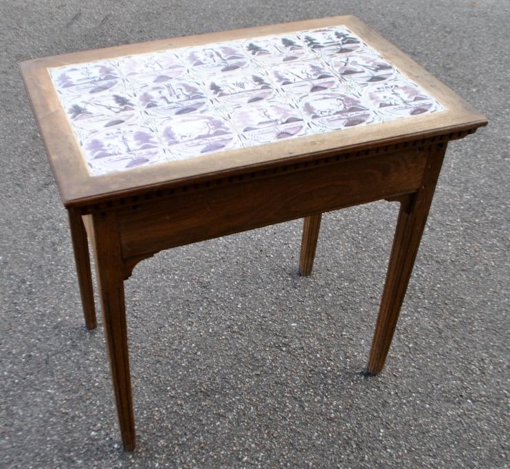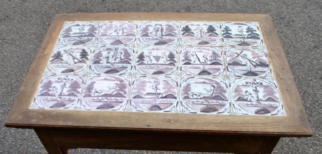 Originalt dansk flisebord, Louis XVI, slutningen af 1700-tallet. Egetræ med tandsnit og kalleringer på ben. Plade i form af 15 hollandske manganfarvede fliser fra 1750 - 1775 med bibelske motiver og oksehoved hjørner. H.: 75 cm. L.: 76 cm. B.: 50 cm.