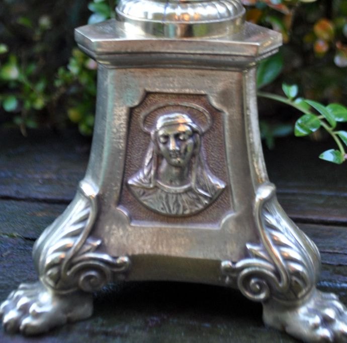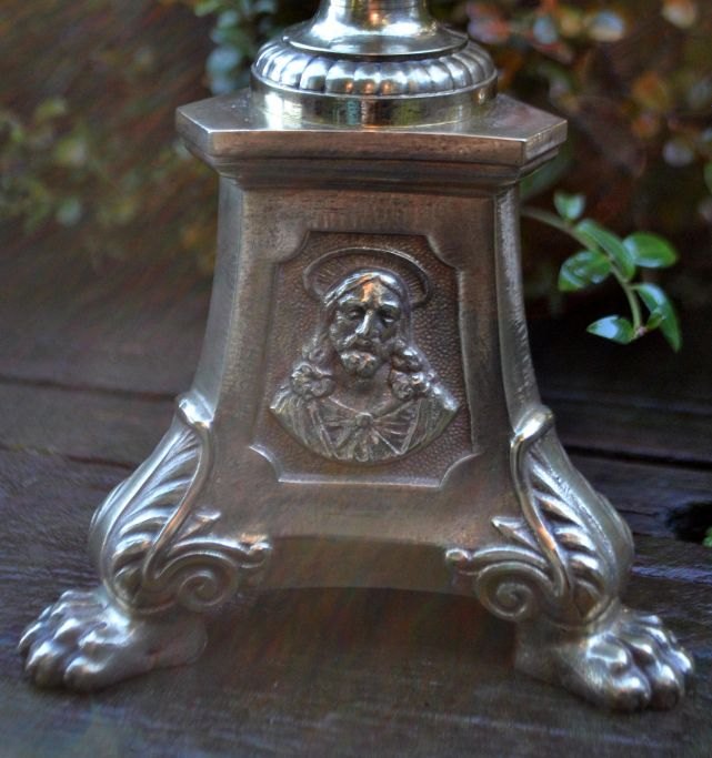 Fransk messing kirke stage, 19. årh. På trekantet fod med løvefødder med motiv af Jesus, Jomfru Maria og brændende hjerter. Stemplet: LF a Paris. H: 46 cm. B: 12,5 cm.