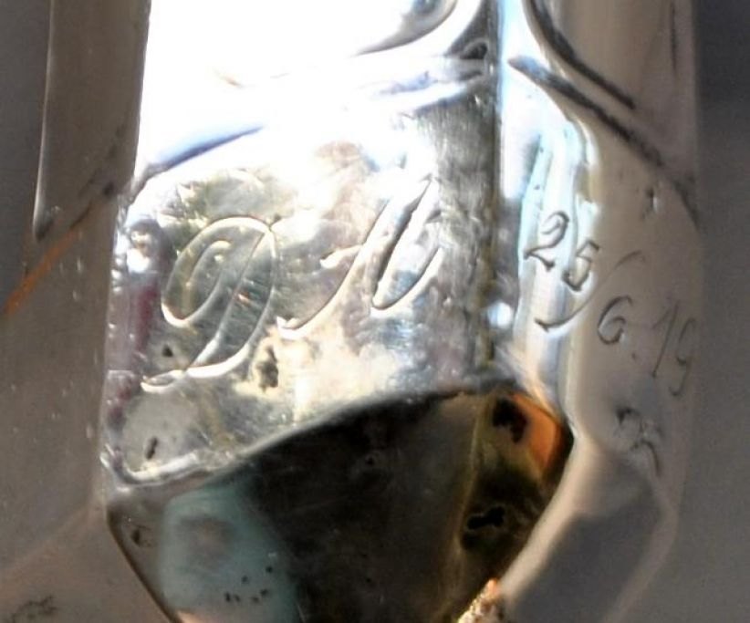 Stok i træ med sølvbeslag, 20. årh. Danmark. Stemplet: 830 S. Indgraveret: DA 25/6 19. L: 92 cm.