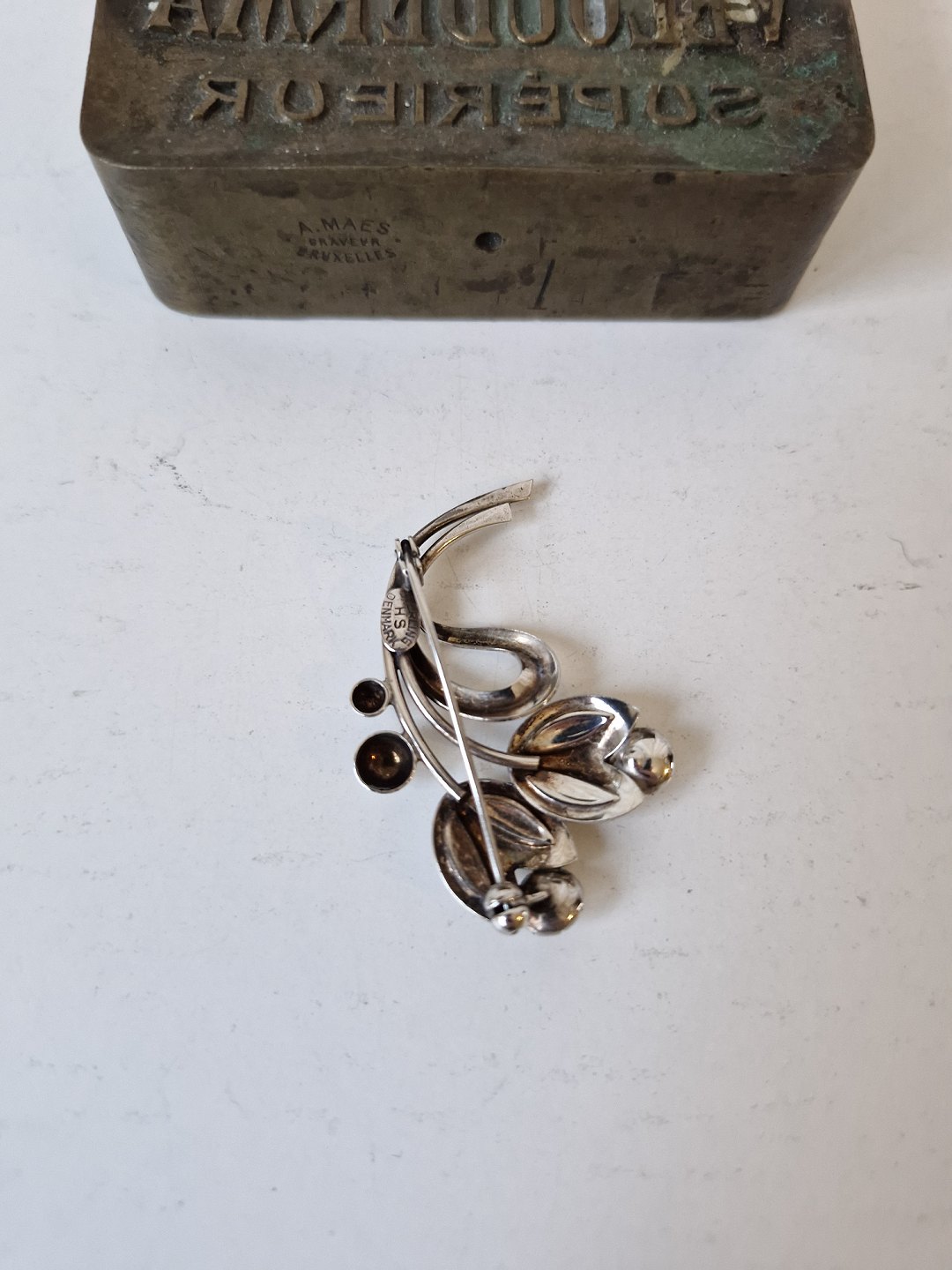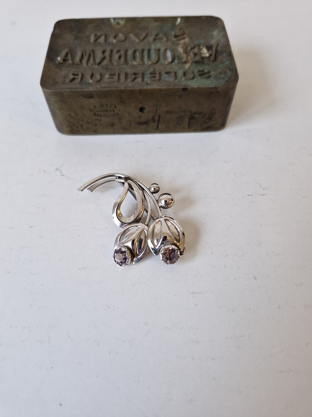 Vintage sølv broche i form af blade og blomster med lilla sten af Hermann Siersbøl
