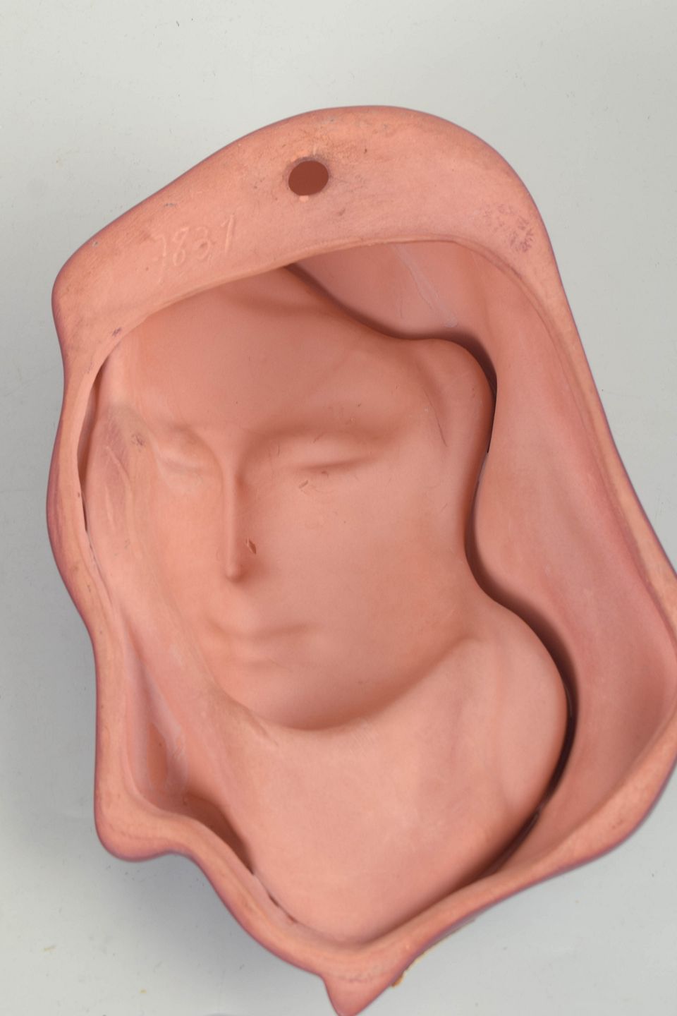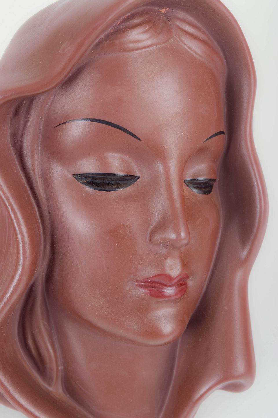 Art Deco wall mask in glazed ceramic, model 7831, formed as a stylised female portrait with a draped veil-like surround. Glaze in a deep burgundy tone. Retains the original Goldscheider Wien sticker label.