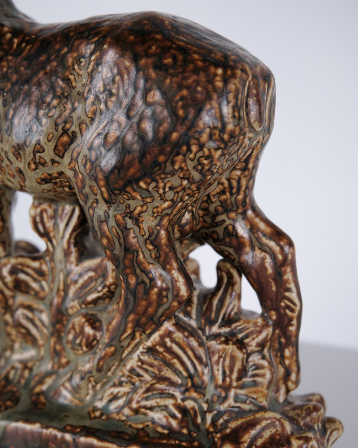 Stentøjsfigur med motiv af stående hjort, model nr. 21333, designet af Knud Kyhn for Royal Copenhagen. Figuren er udført i stentøj og indgår i Knud Kyhns serie af dyrefigurer produceret hos Royal Copenhagen i midten af det 20. århundrede. Modellen er kendetegnet ved en markant kropsform og tydelig bearbejdning af overfladen, som er gennemgående for Kyhns arbejde med naturmotiver.