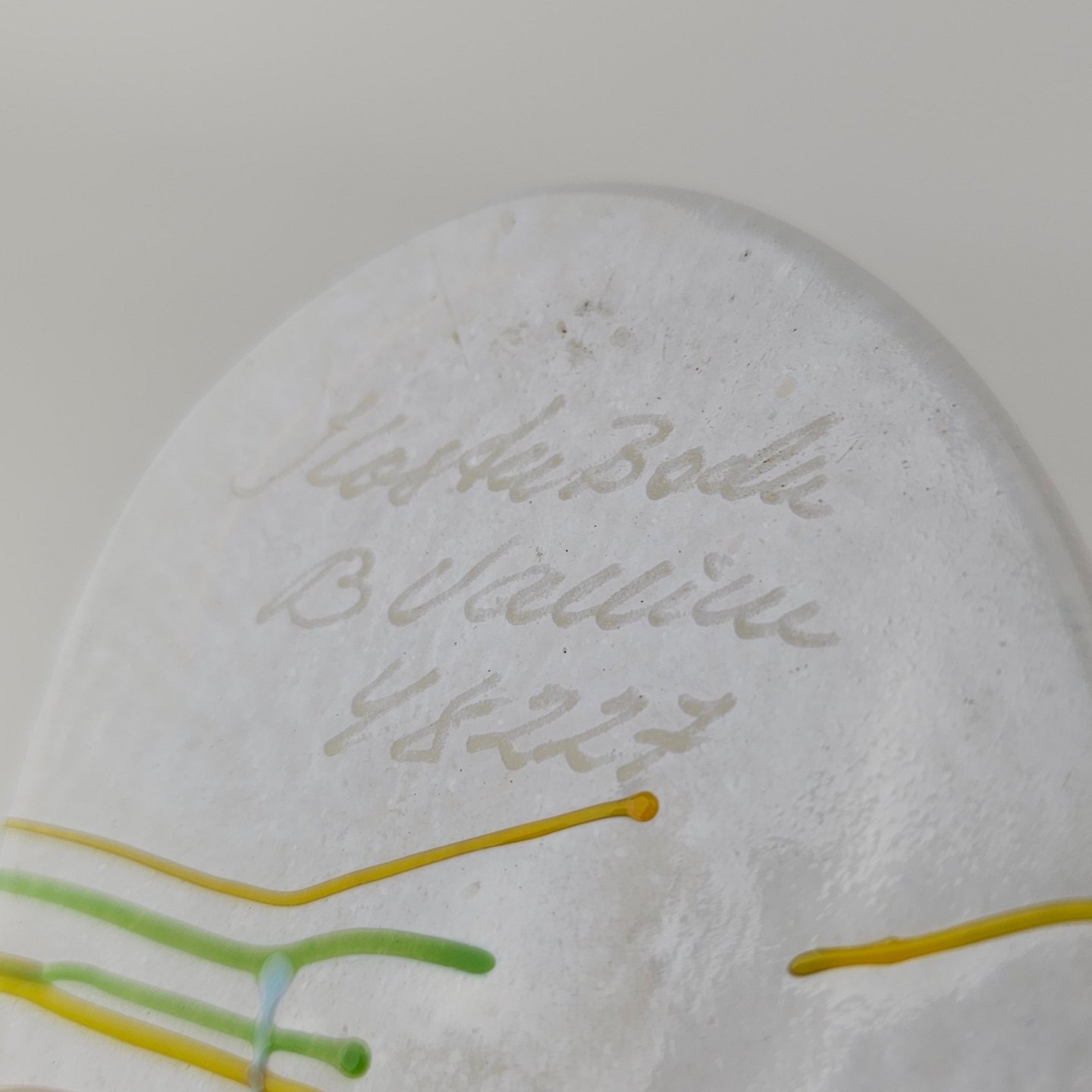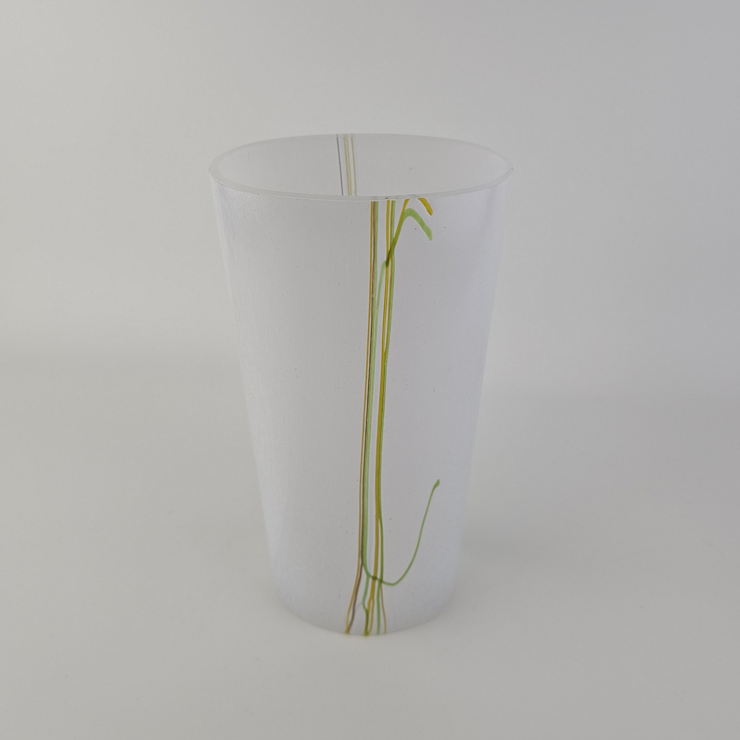 Vase i glas med dekoration af linjer og streger i flere farver