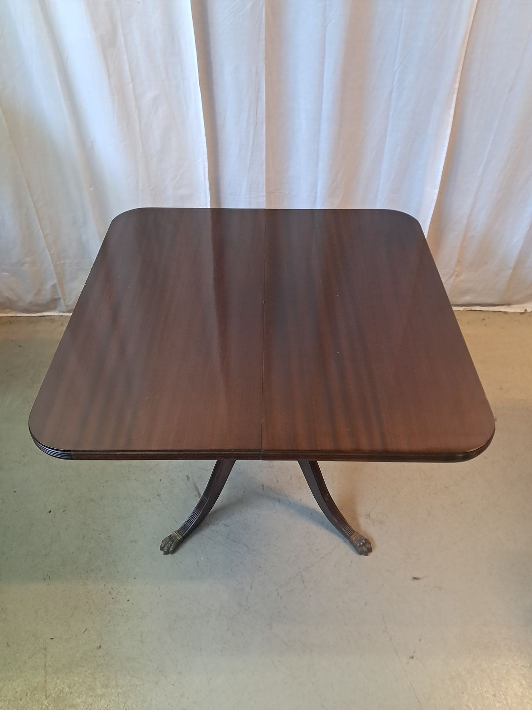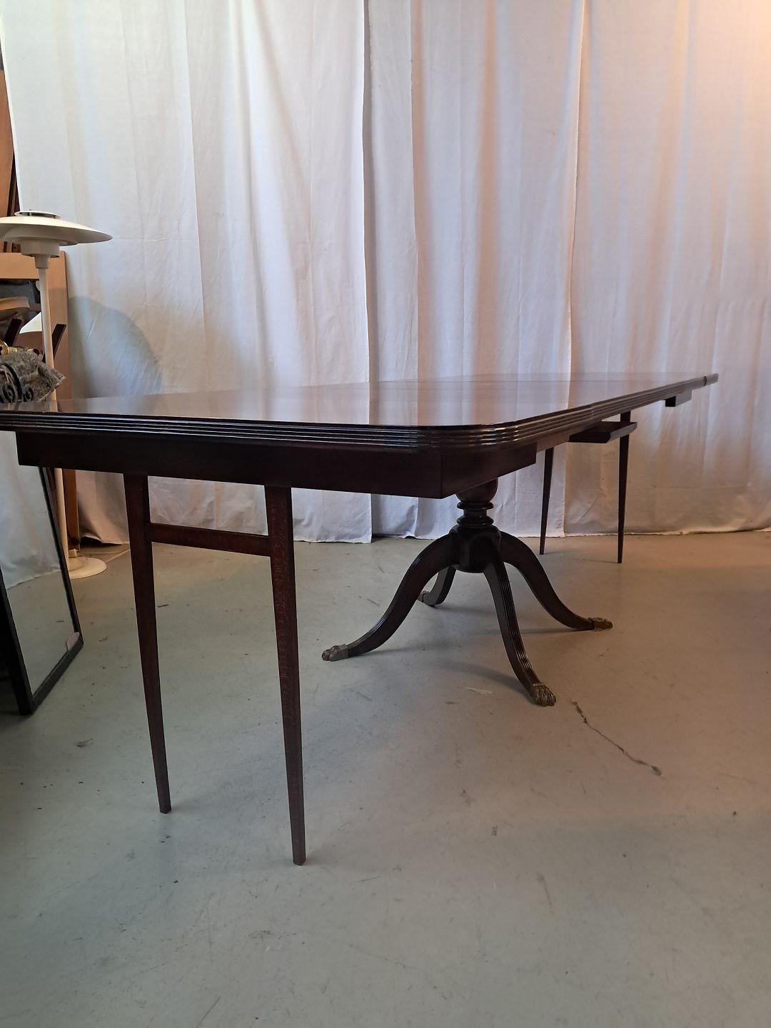 Spisebord i fineret mahogni med 3 tillægsplader, fra 1980erne.
