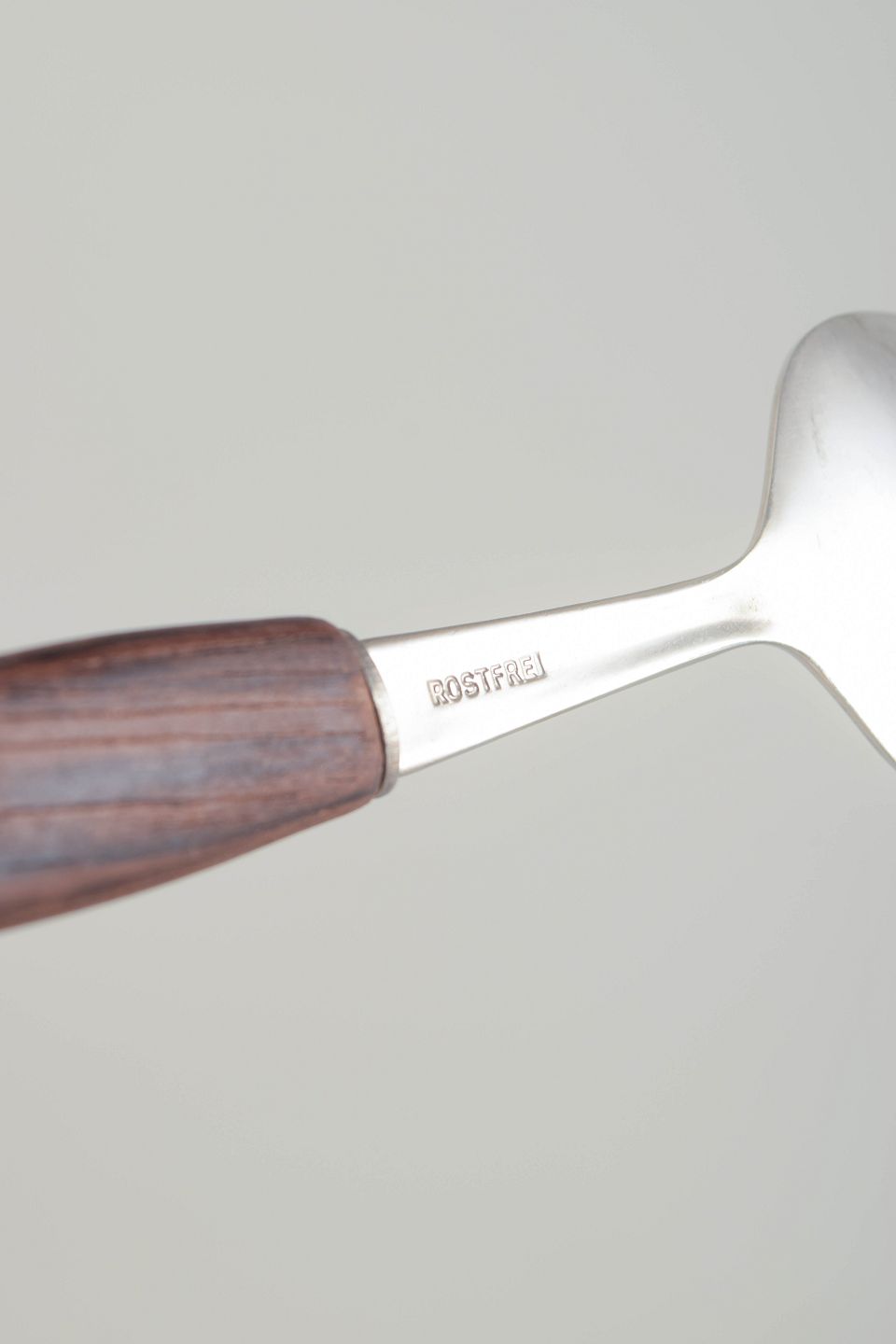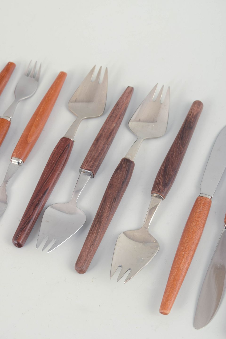 Skandinavisk bestikdesign i 1960’erne var præget af rene linjer og funktionel enkelhed, hvor varme naturmaterialer som træ blev kombineret med rustfrit stål. Udtrykket er tidstypisk modernistisk og velegnet til både daglig brug og borddækning i vintage-stil.