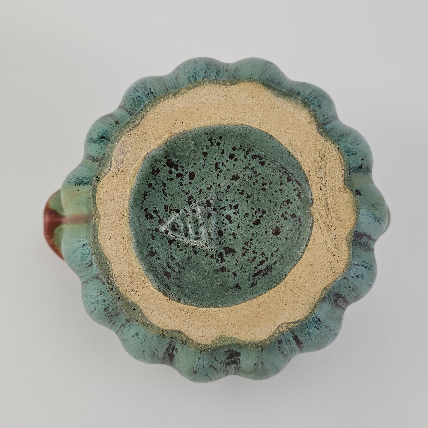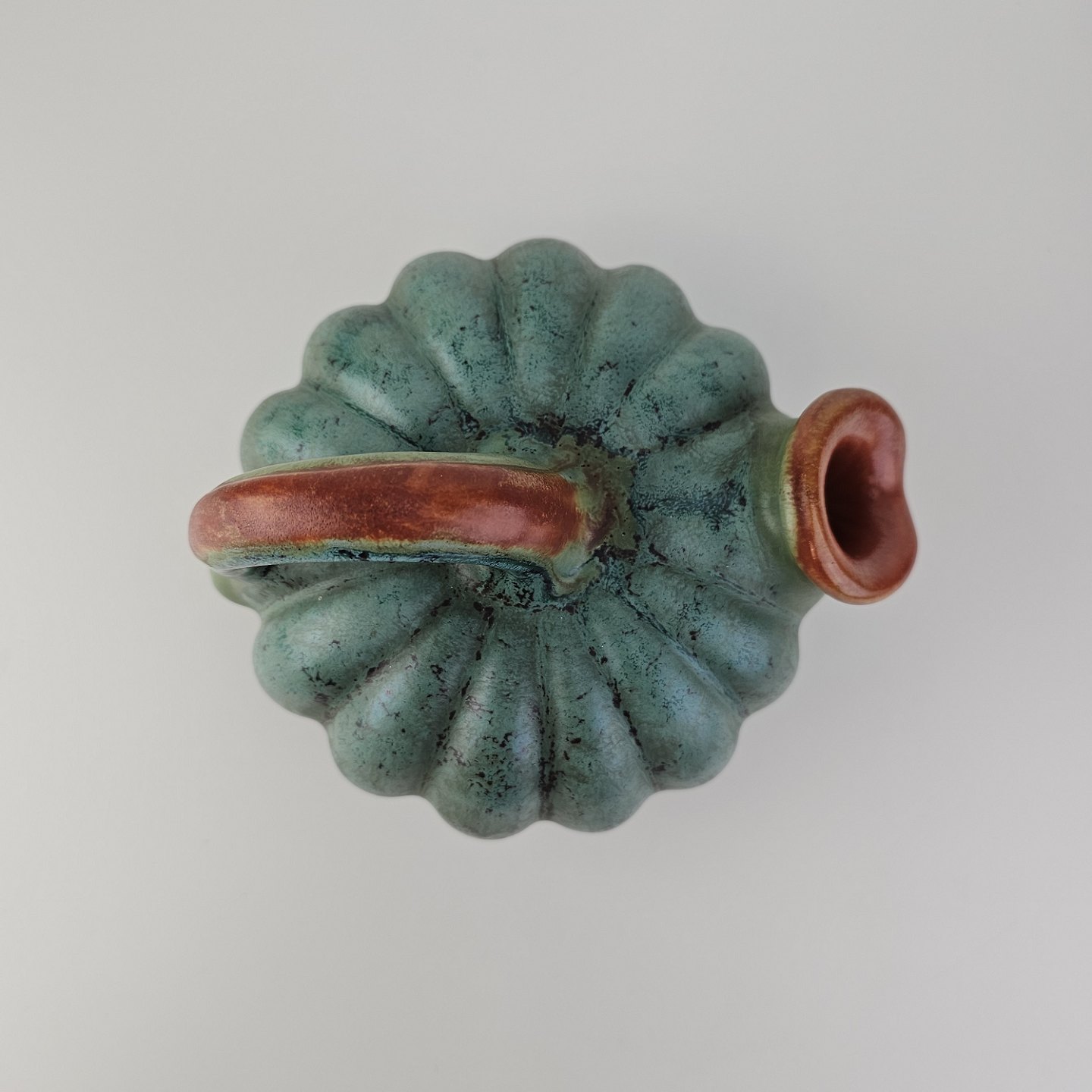 Kande i keramik med form som et græskar og grøn og brun glasering