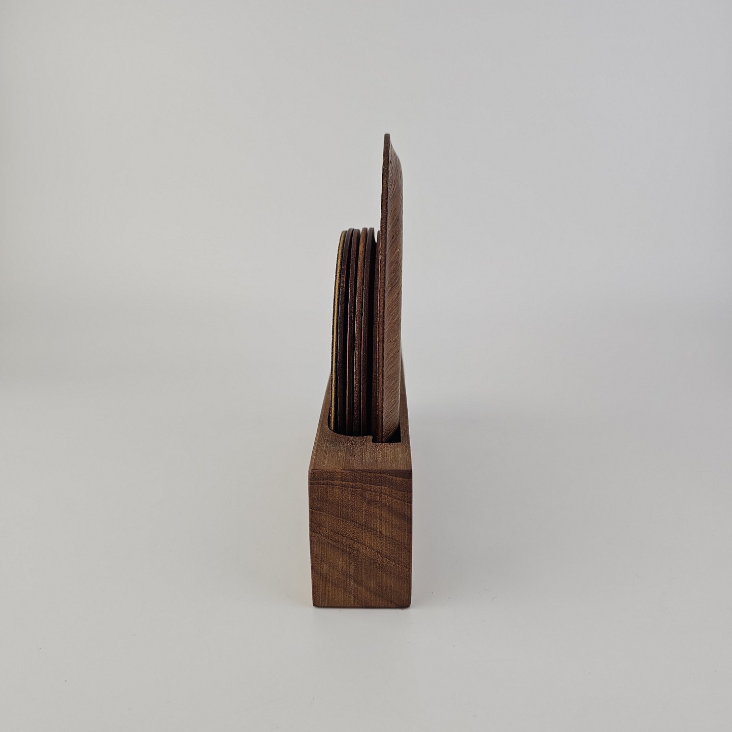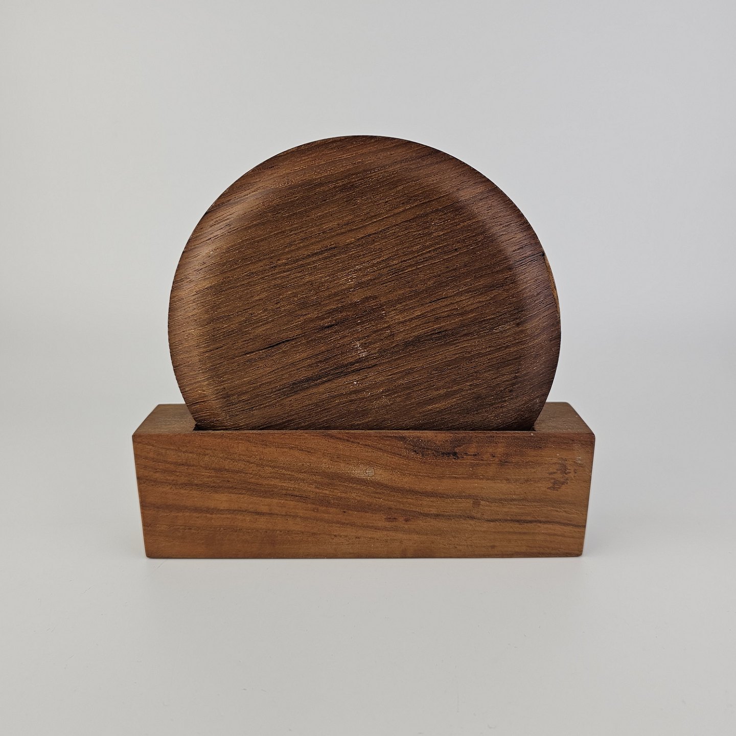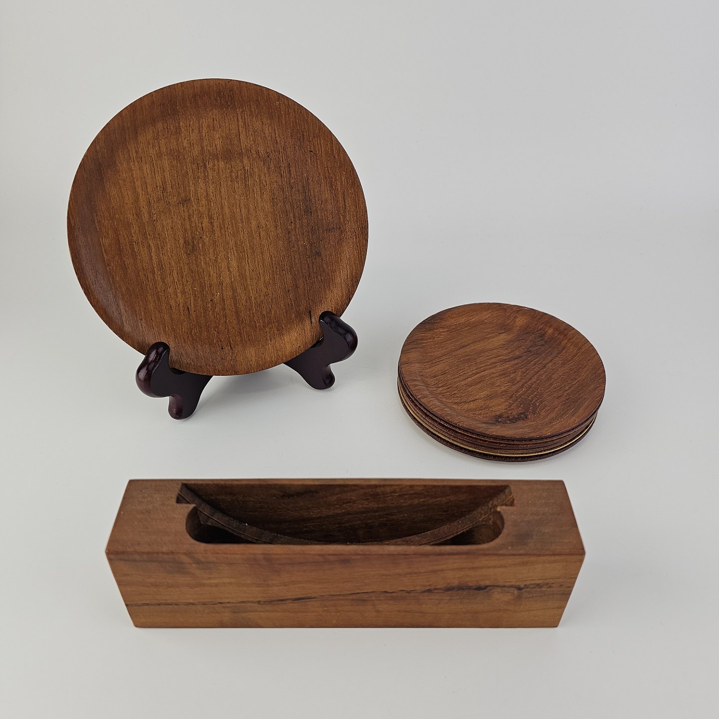 Bordskånere af teaktræ i to forskellige størrelser til kopper og en kande. Holder inkluderet.