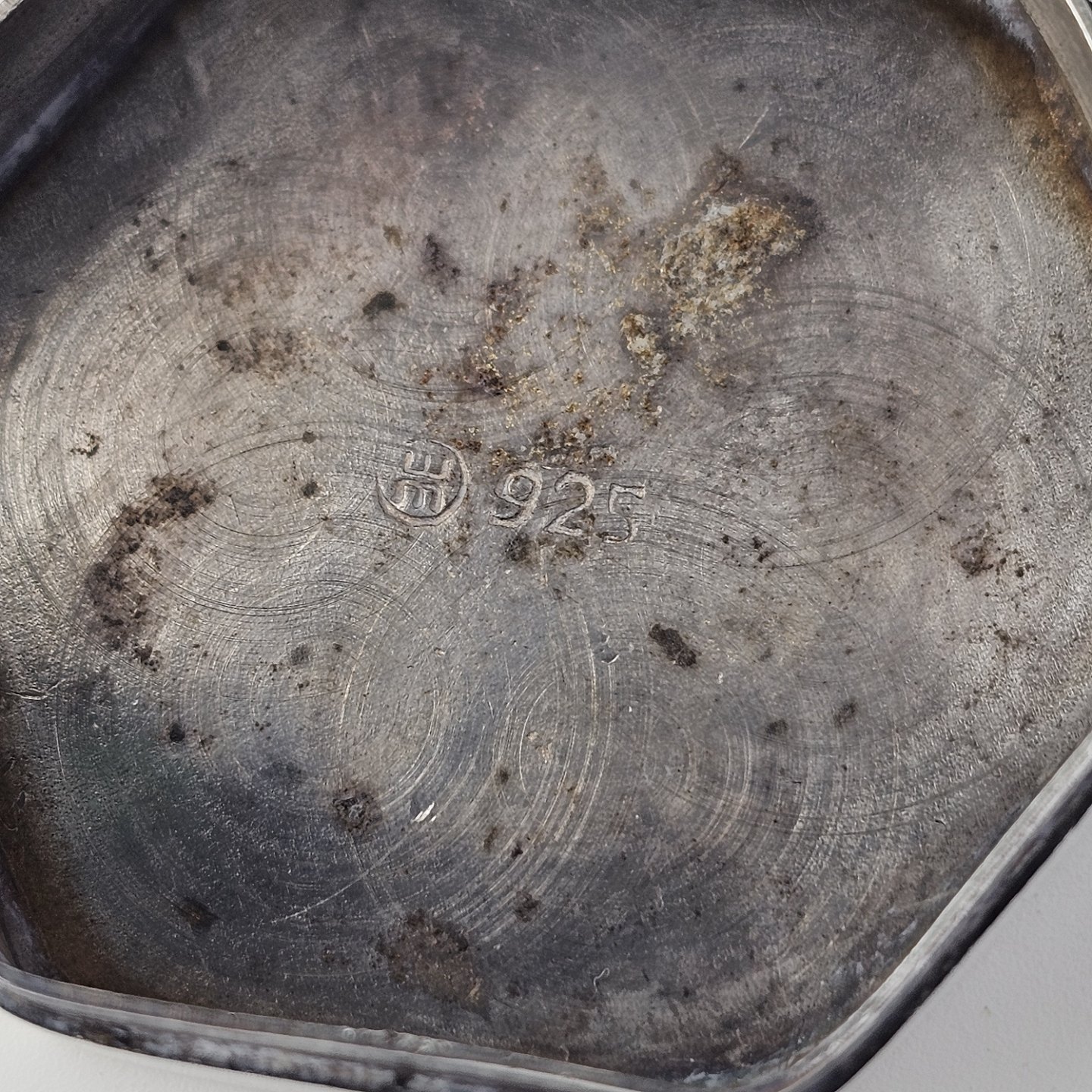 Sekskantet pilleæske i sterling sølv med indgraveret bladmotiv