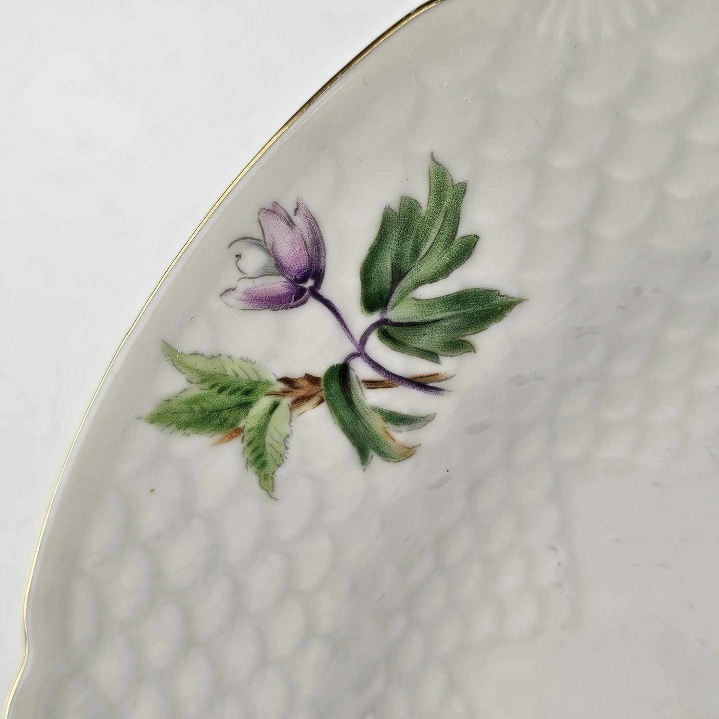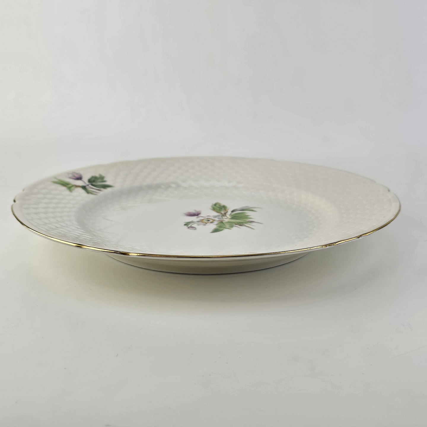 Frigga Anemone er cremefarvet porcelæn dekoreret med motiv af anemoner og bøgeløv med guldkant