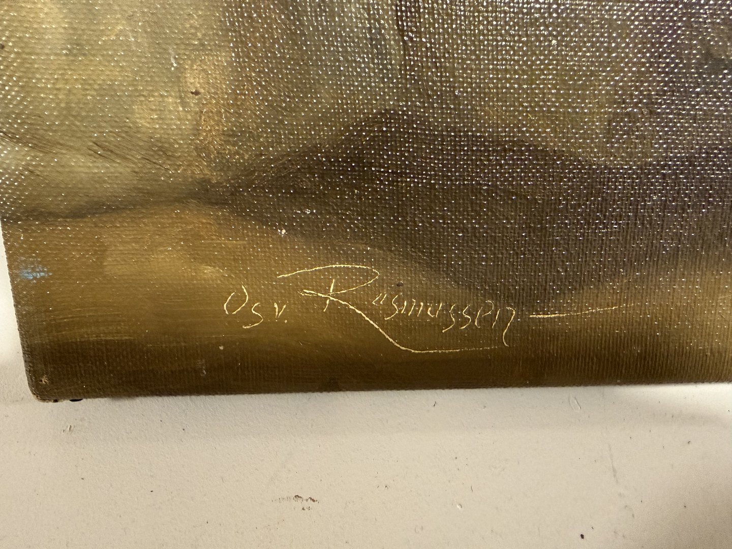Osvald Rasmussen (1885-1972), Uindrammet maleri på lærred af interiører med ildsted / køkken fra 1747, signeret Osv Rasmussen, Mål 49x39cm.