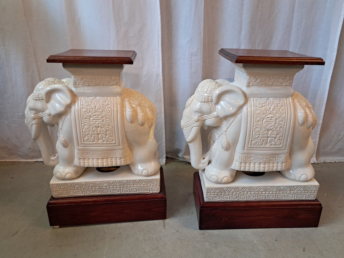 2 Pocelæns-elefanter med træsokkel og topplade, fra 2000erne.