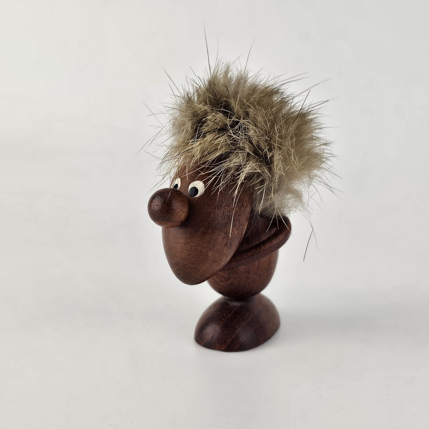 Håndskåret figur af teak med støvet blond hår og arme af læder. Fra 1960'erne