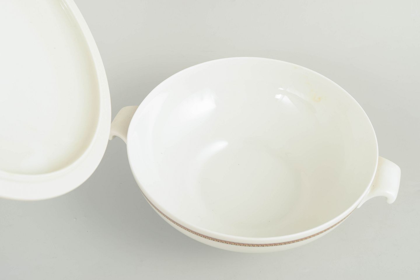 Terrin med låg i porcelæn fra Rosenthal Classic, dekoreret i serien Mayfair med mørk bort, stiliserede grønne bladranker og gulddetaljer, produceret i 1980’erne.