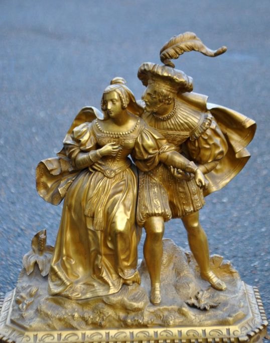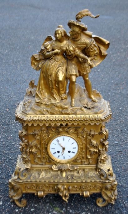 Fransk kaminur i lueforgyldt bronze, 1810 - 1820. Charles X. Uret dekoreret med figurer forestillende en kavaler og en kvinde. Detaljeret kasse. Med hvidemaljeret skive. H.: 70 cm. B.: 39 cm. D.: 14 cm.