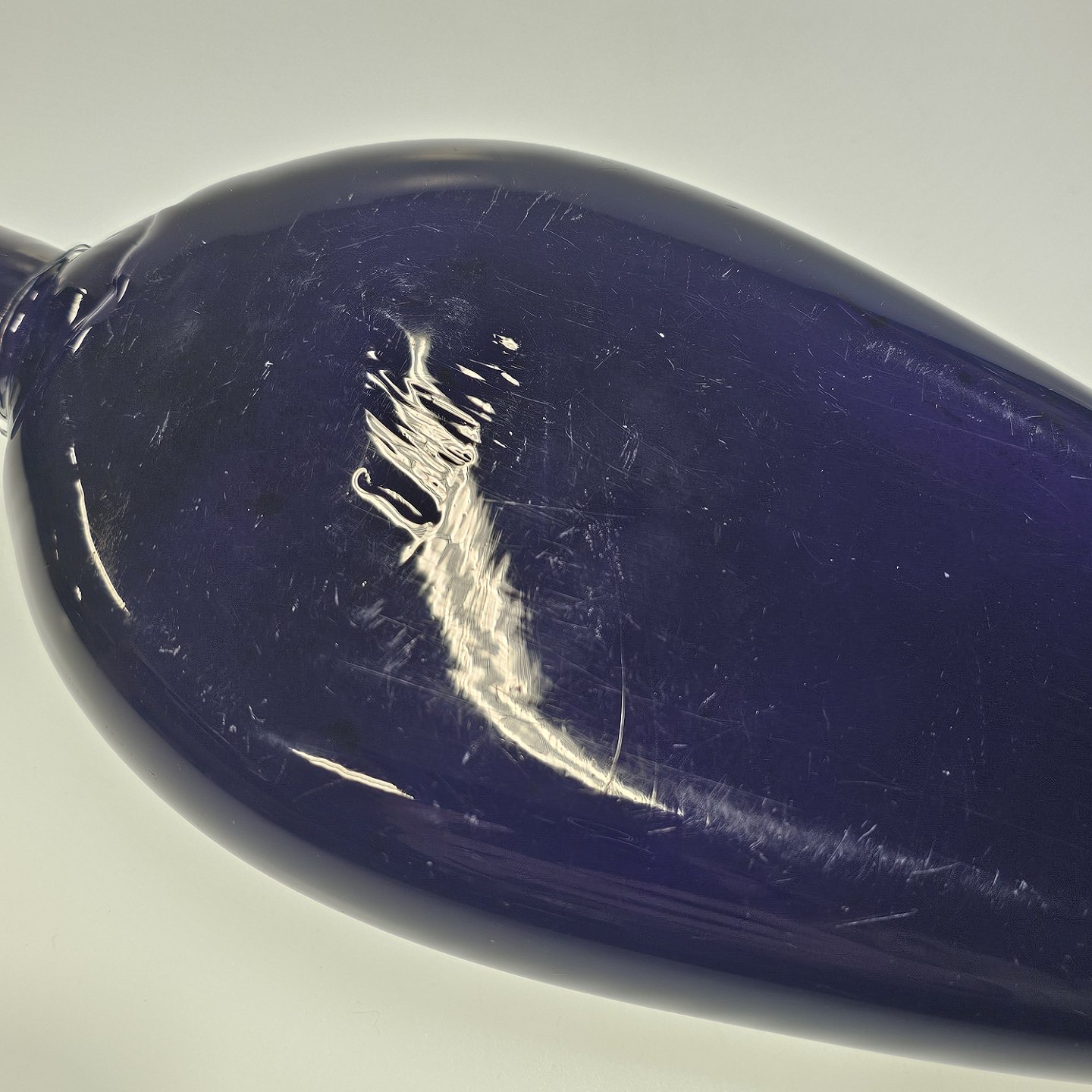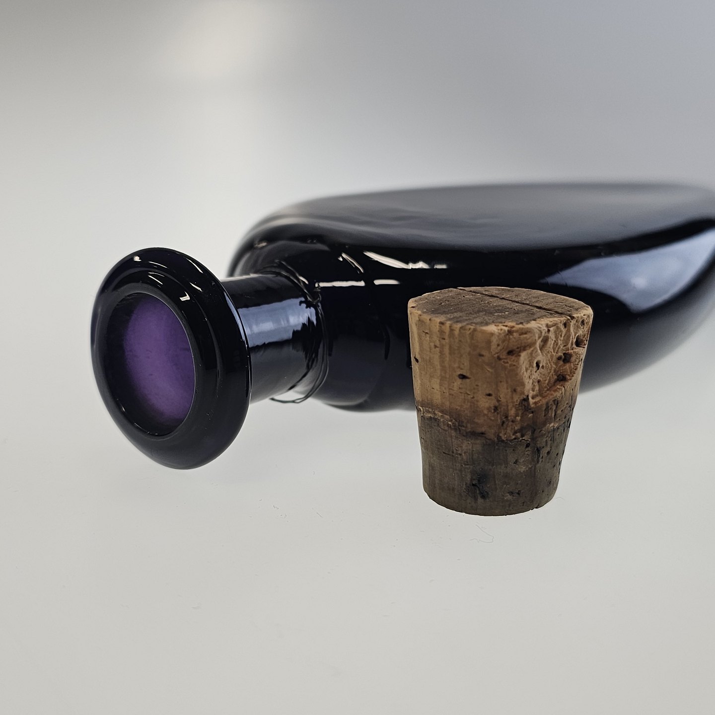 Håndblæst dråbeformet flaske i lilla glas med korkprop