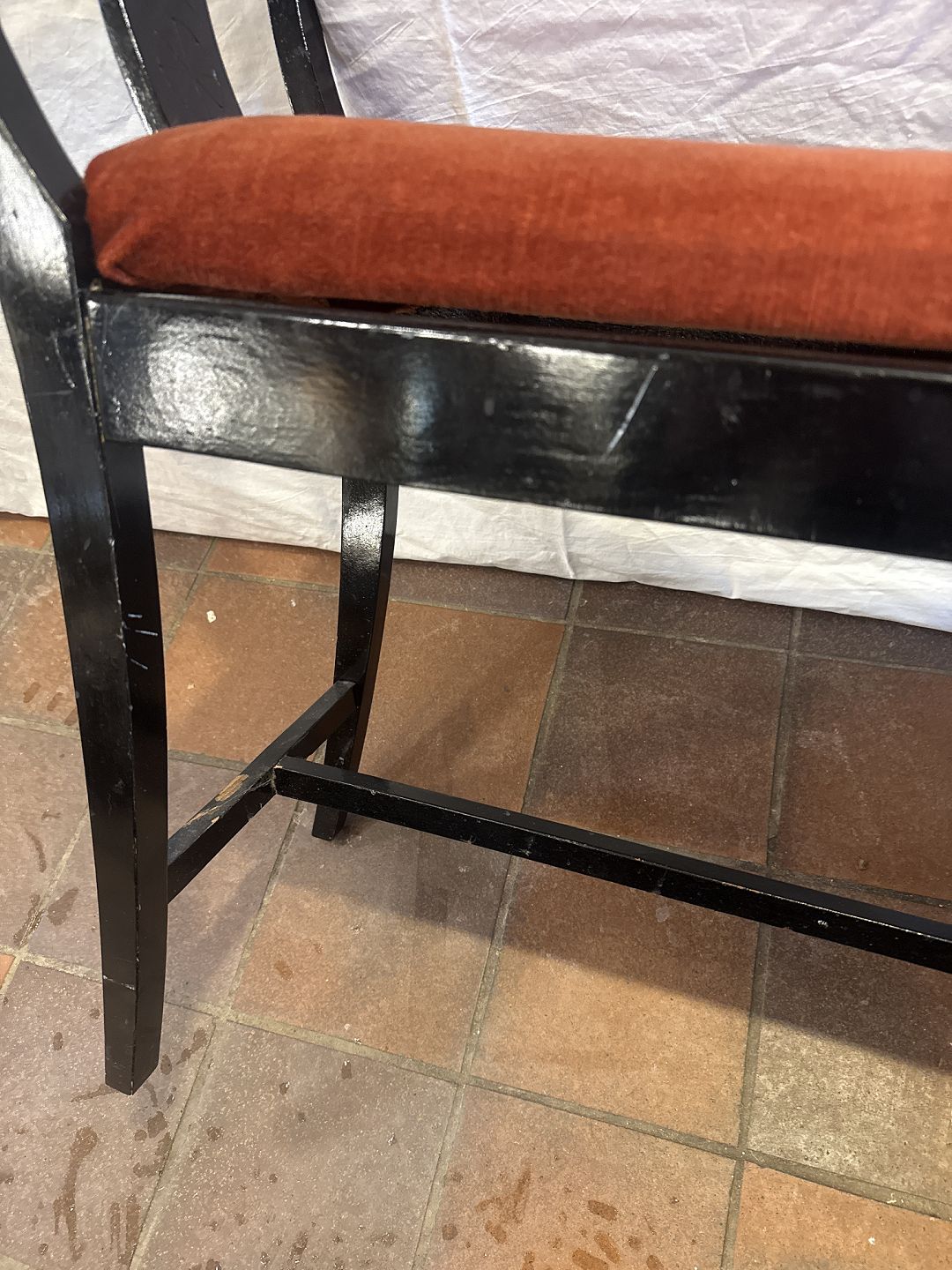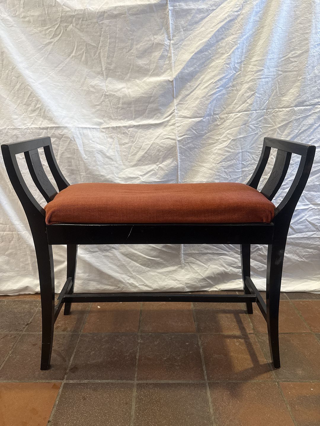 Klaverbænk i sortlakeret træ betrukket m. rødt velour stof.