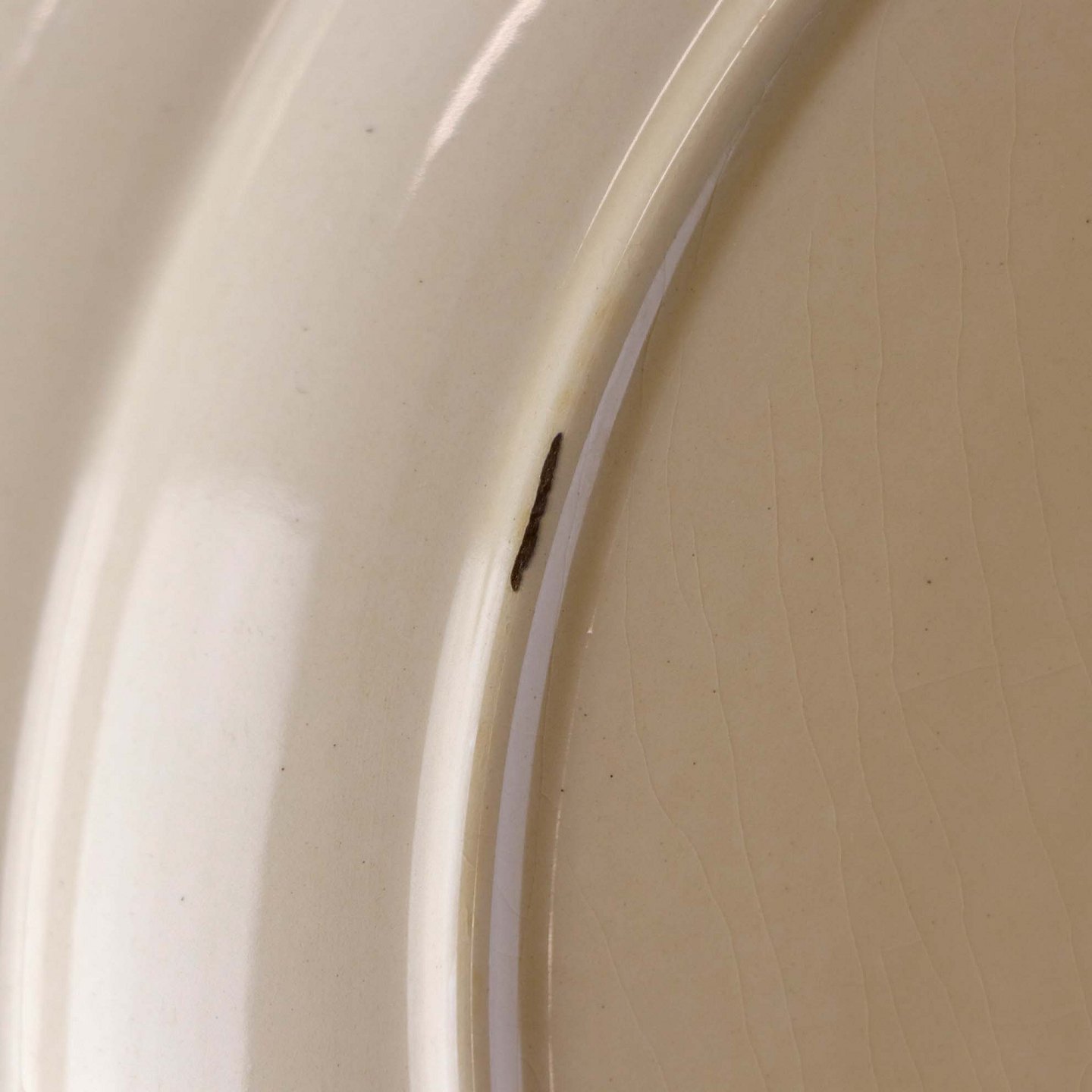 Fremstår med bruneringer under glasuren og krakkeleringer i glasuren.