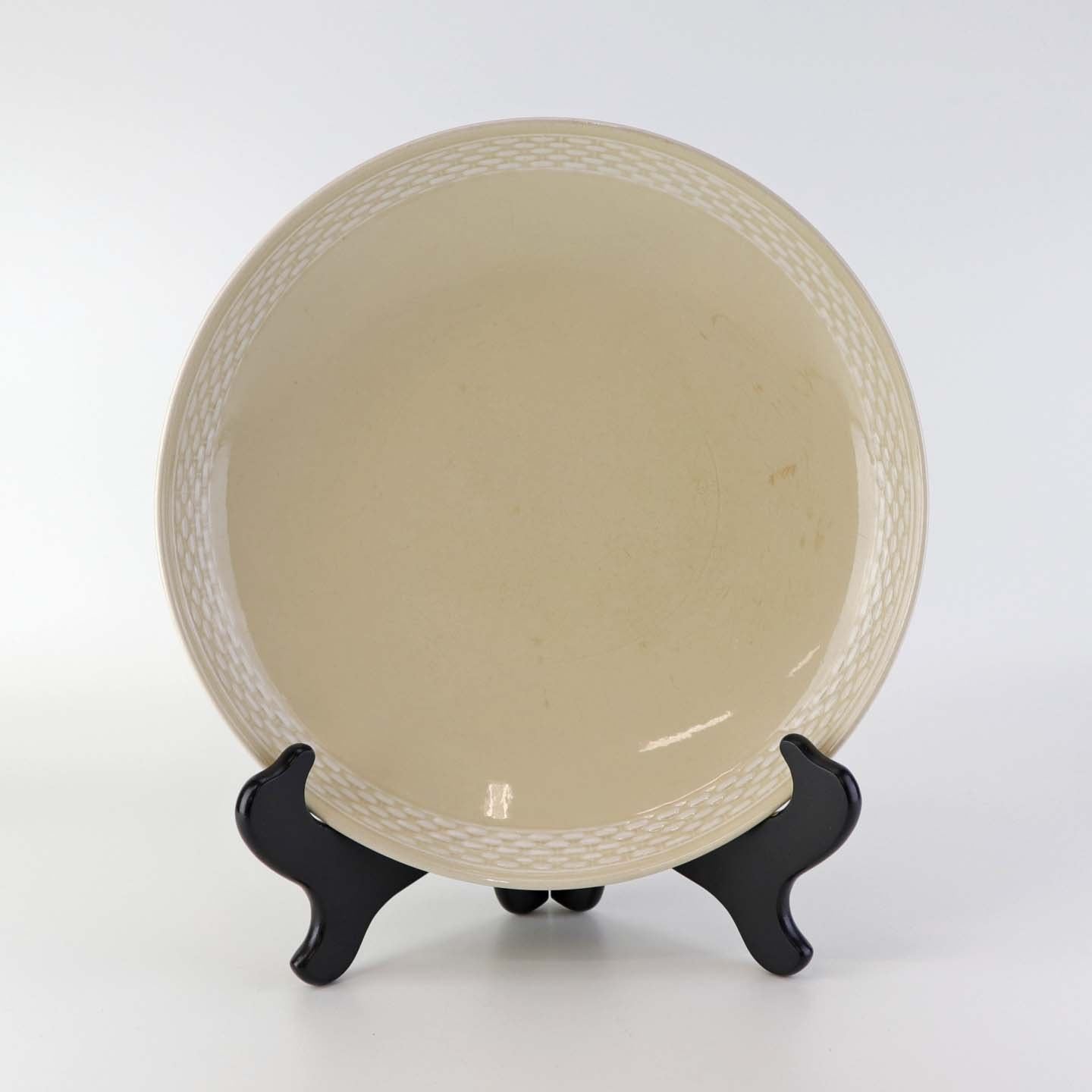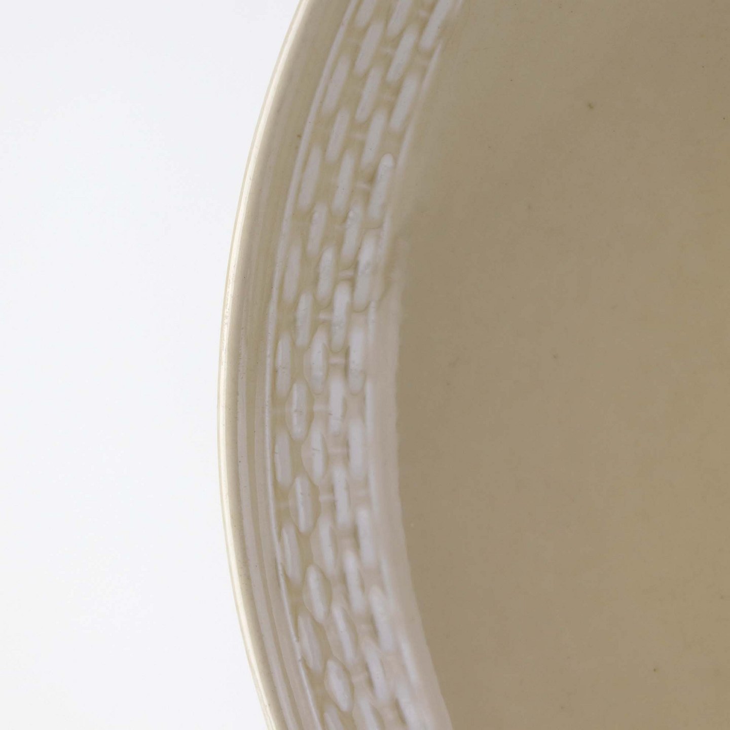 Sandfarvet fajancestel i stelform Viktoria II - Fletværk med dekoration af hvidt flet på gullig baggrund.