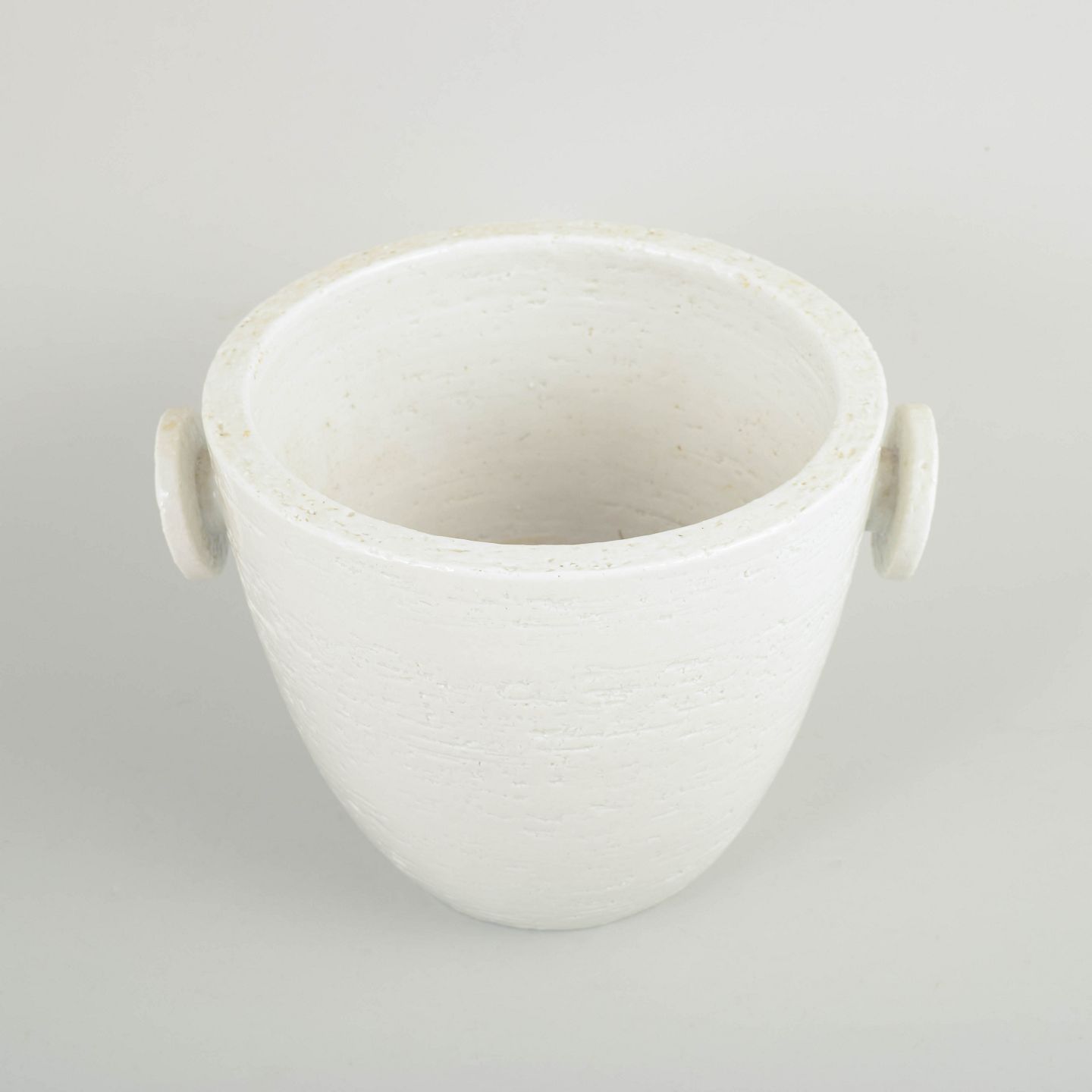 Stor cylindrisk champagnekøler/isspand i hvidglaseret stentøj med let konisk korpus og to markante sidehanke. Overfladen fremstår med diskret struktur og mat hvid glasur. Stemplet i bunden.