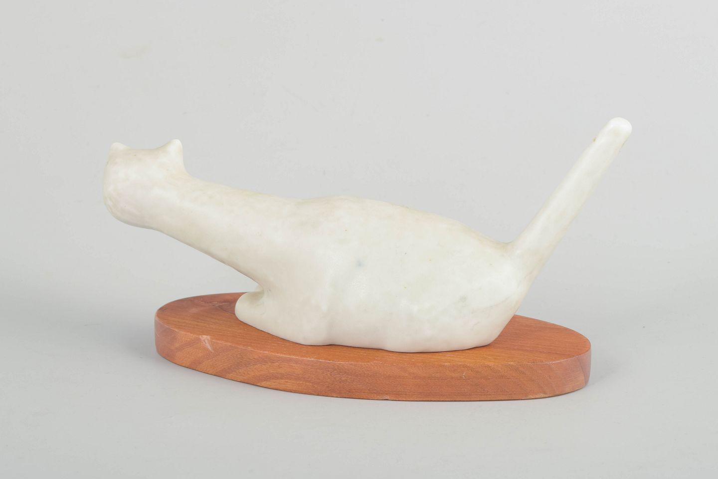 Naturalistisk udformet kat i hvidt stentøj med stiliseret, langstrakt krop og løftet hale. Figuren står på en oval træfod og fremstår med enkel, modernistisk formgivning karakteristisk for Rörstrands produktion i midten af det 20. århundrede.