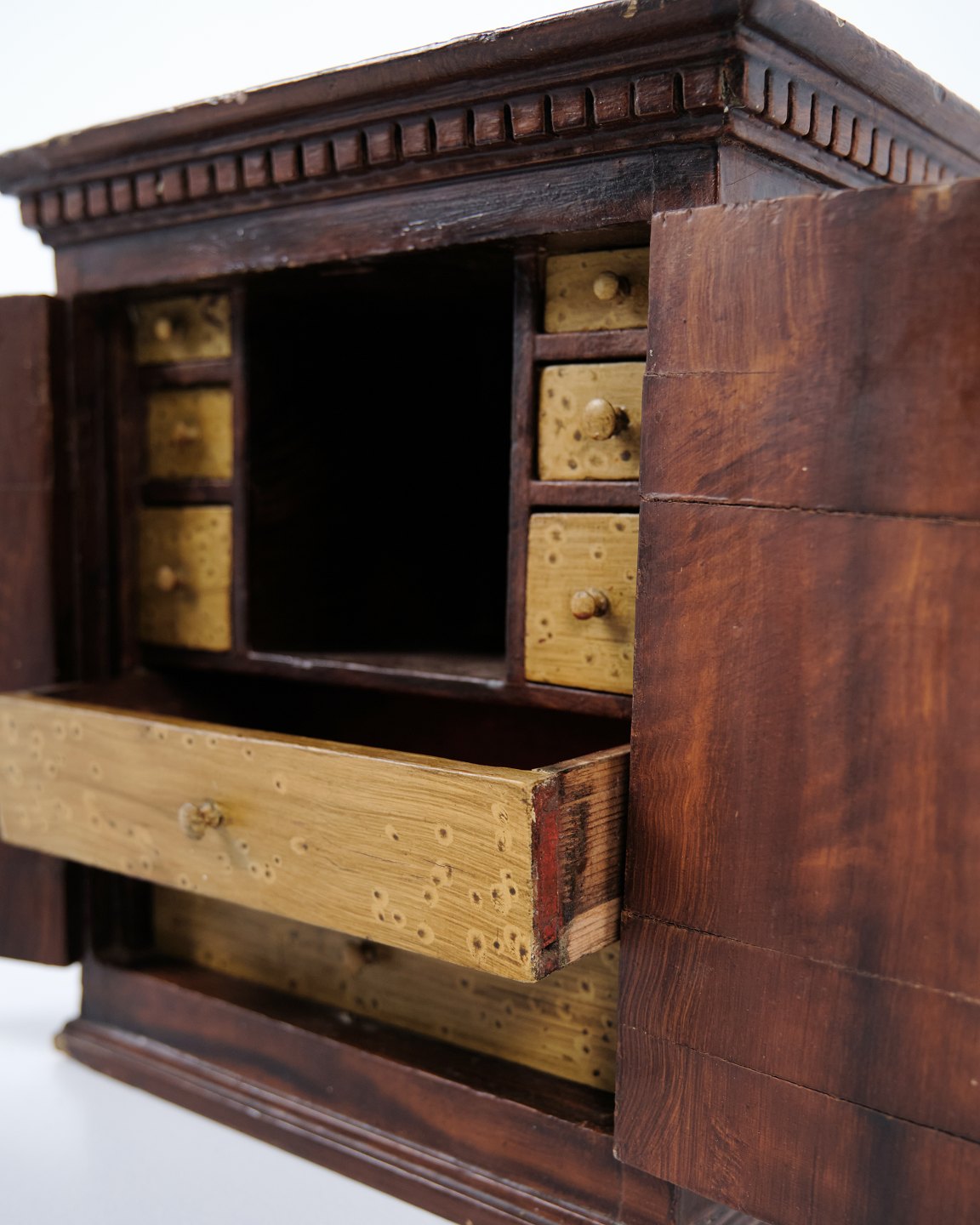 Antikt miniaturemøbel i åremålet fyrretræ med håndsmedede beslag fra 1840’erne. Unikt og dekorativt samlerobjekt med historisk karakter.