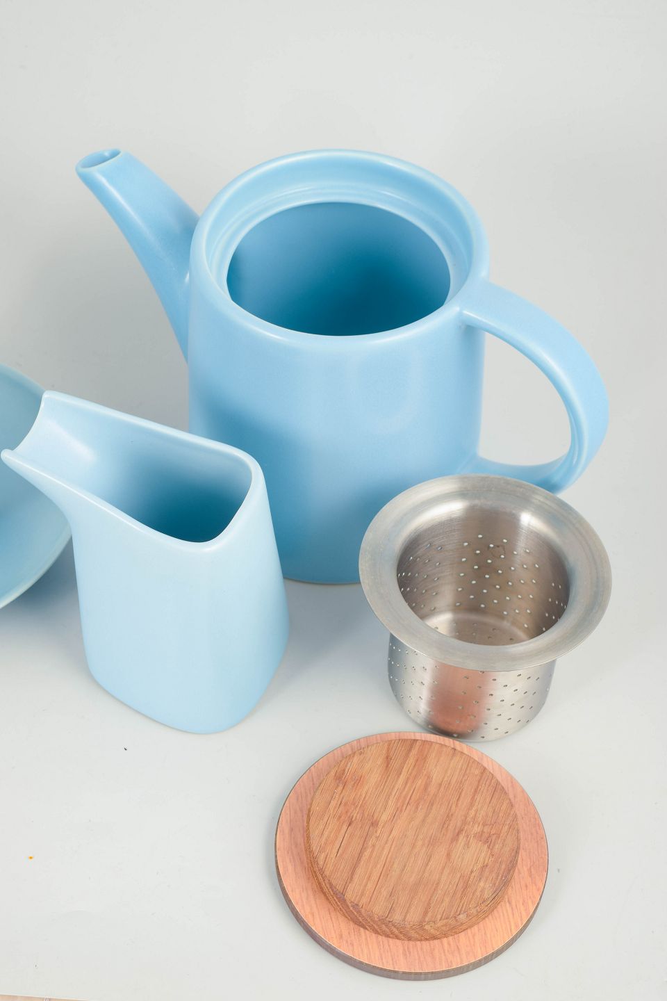 Tesæt i stentøj bestående af tre krus, tekande med tilhørende tesi, flødekande og underkopper. Udført i lyseblå glasur med enkle moderne former. Stemplet Höganäs Keramik, Made in Sweden model 3.
