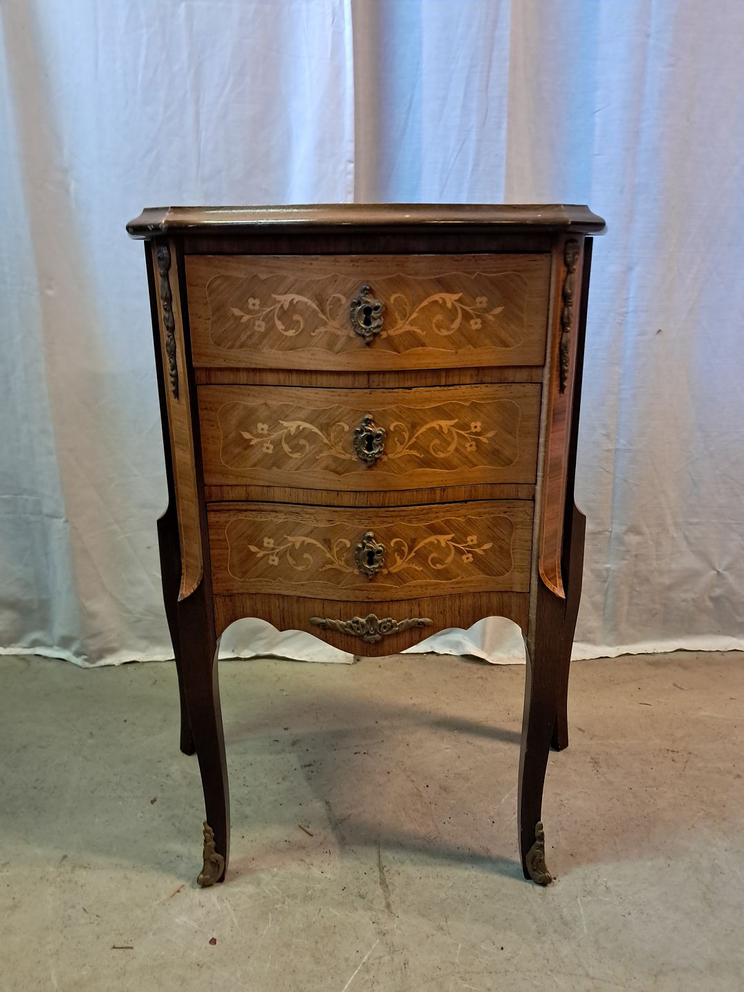 Kommode i fineret mahogni med intarsia, fra 1980erne.