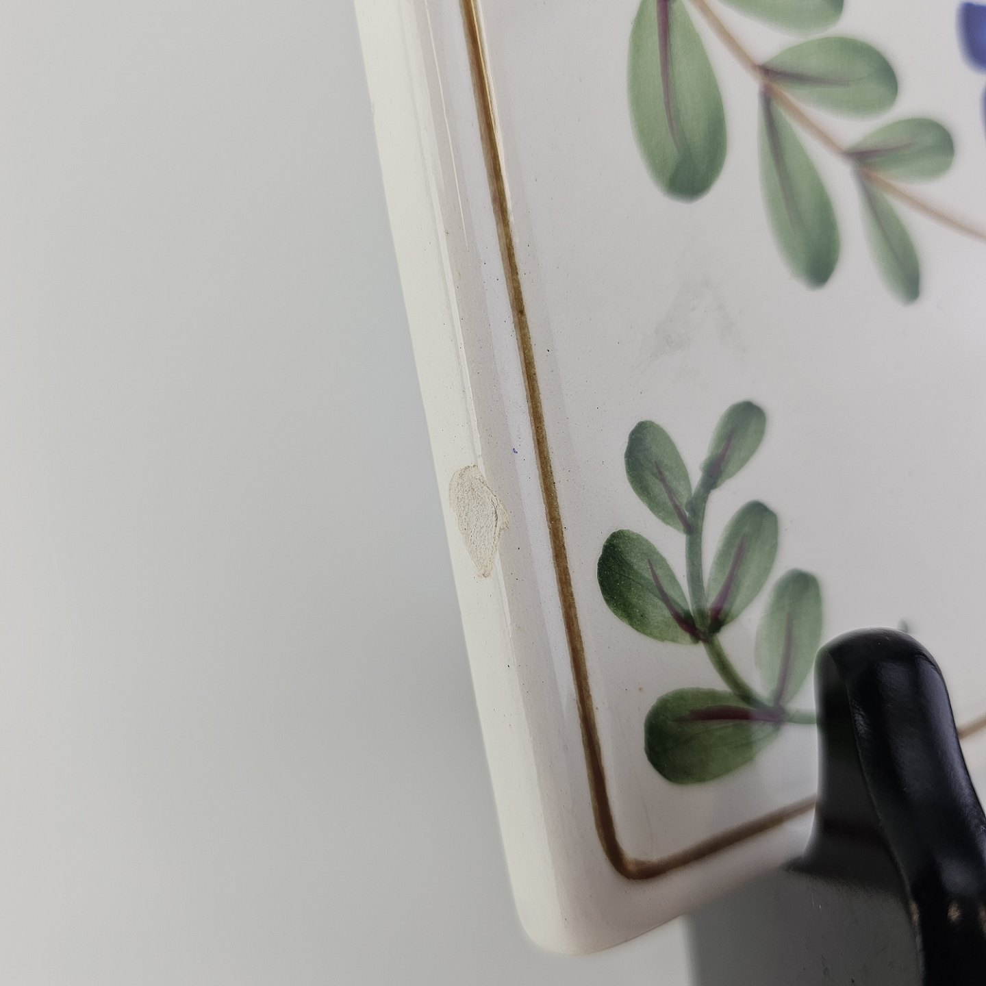 Fajancestel med dekoration af ranker af blåregn og blade på lys baggrund afsluttet med kant af runde blå pletter.