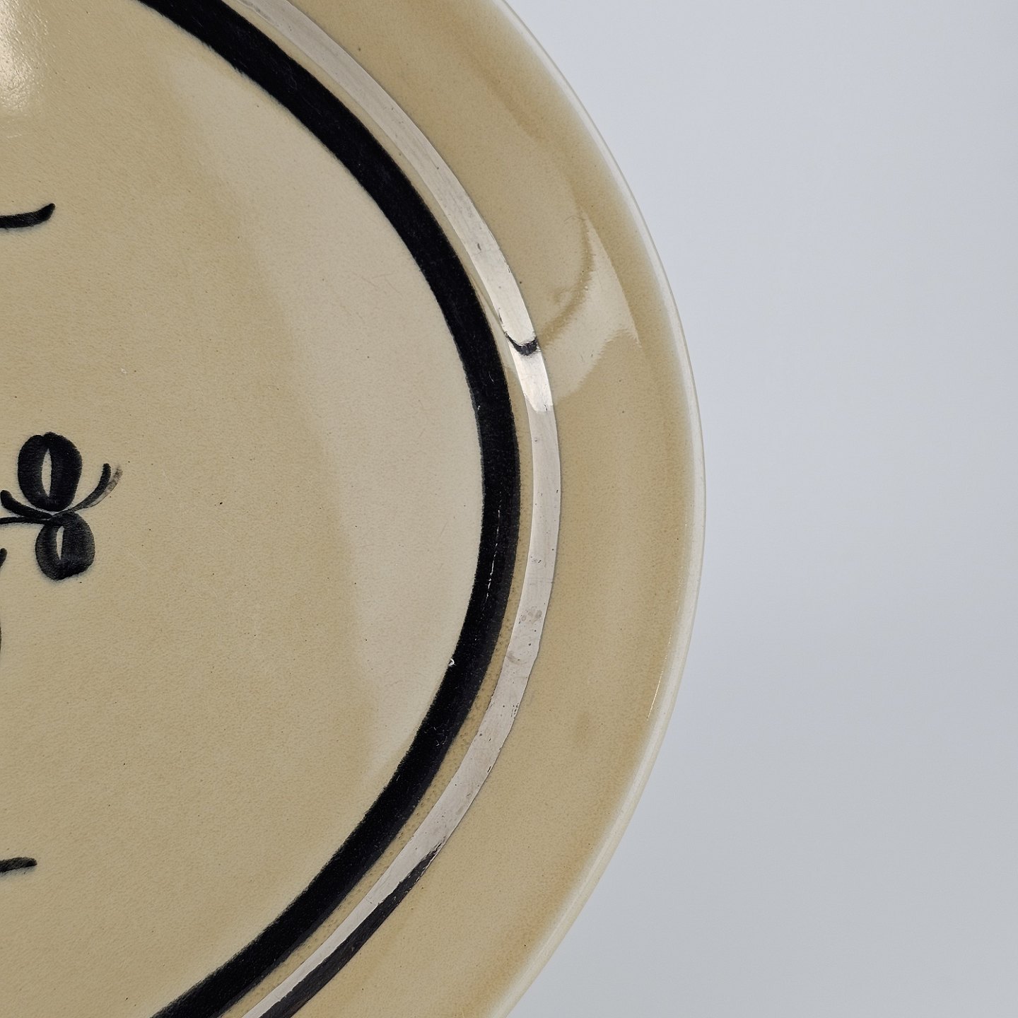 Råhvidt fajancestel i stelform E med dekoration af naturmotiver i sølv og sort farve.