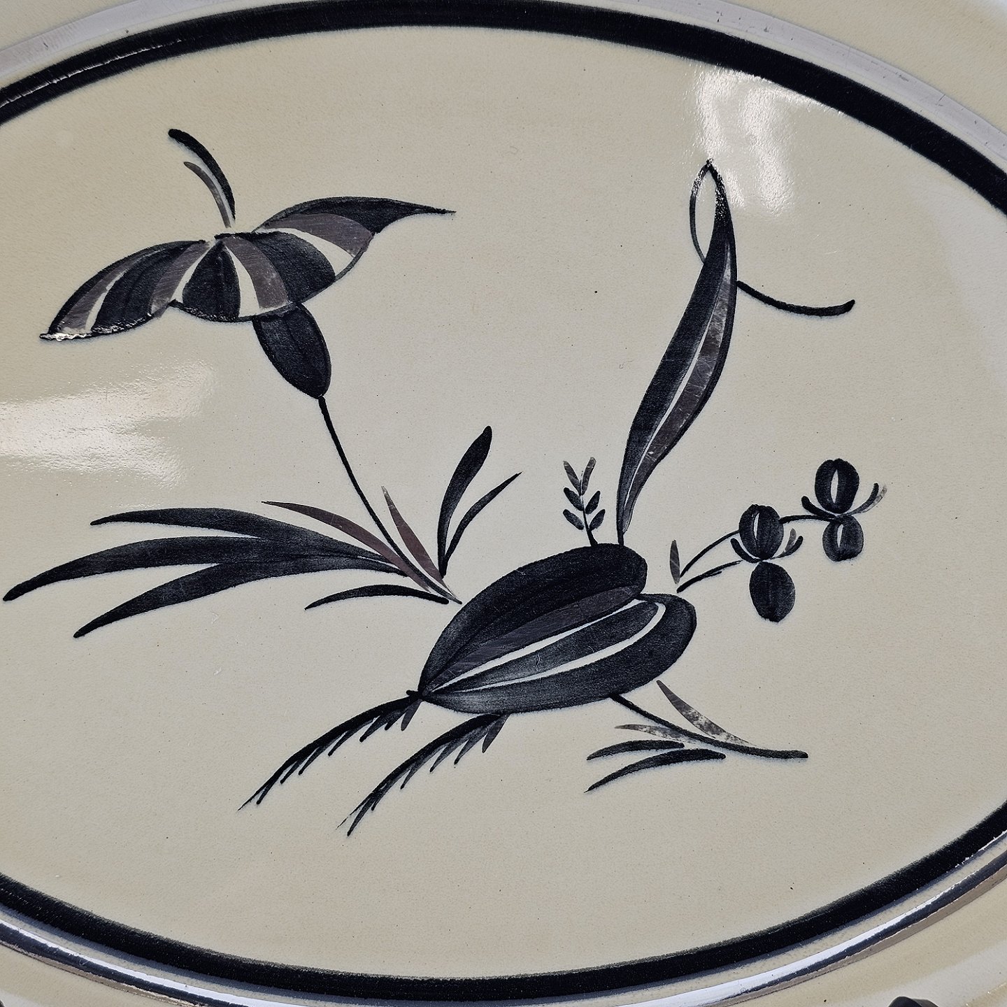 Aflangt ovalt fad i fajance fra stellet Dragsholm fremstillet i perioden 1934-1965.