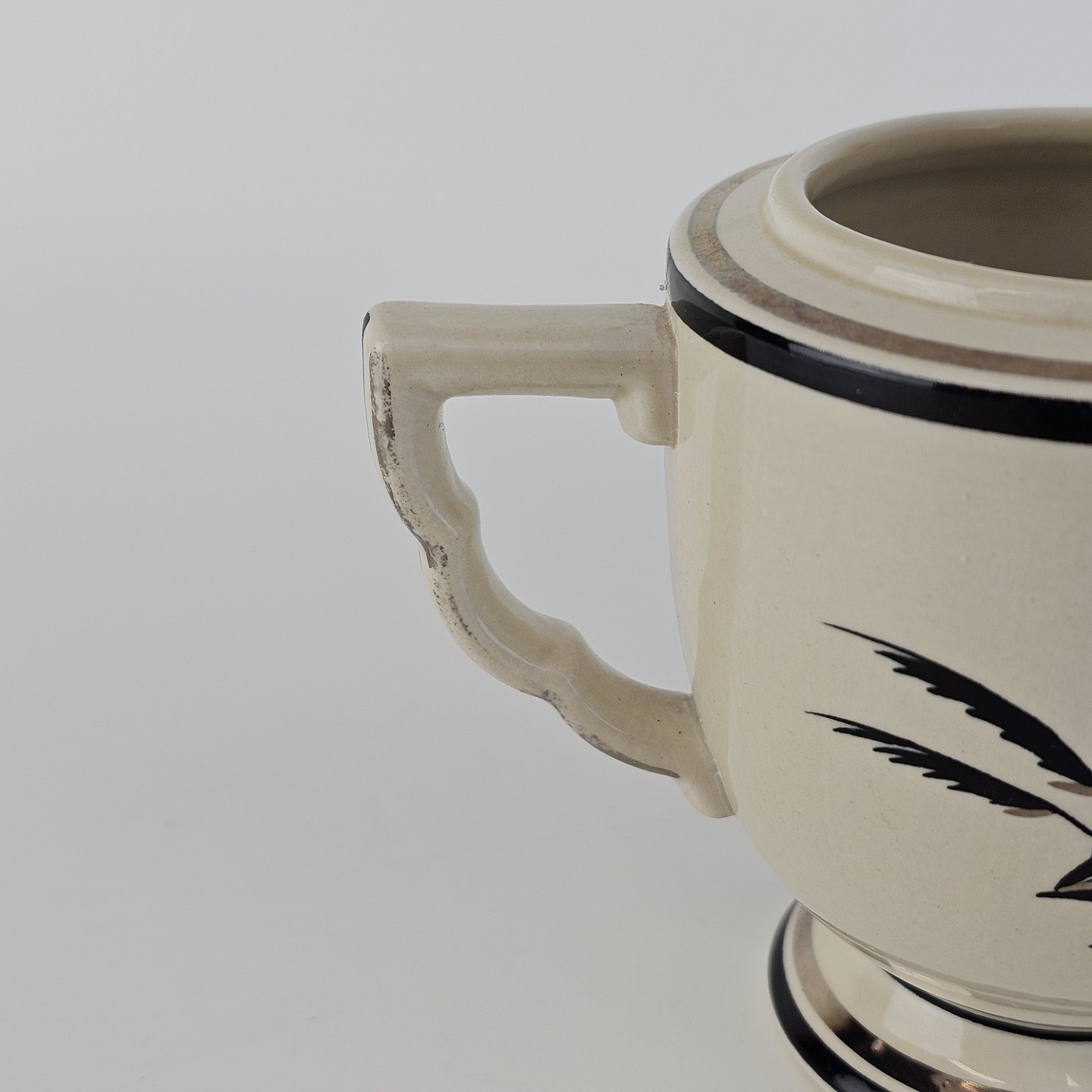 Råhvidt fajancestel i stelform E med dekoration af naturmotiver i sølv og sort farve.