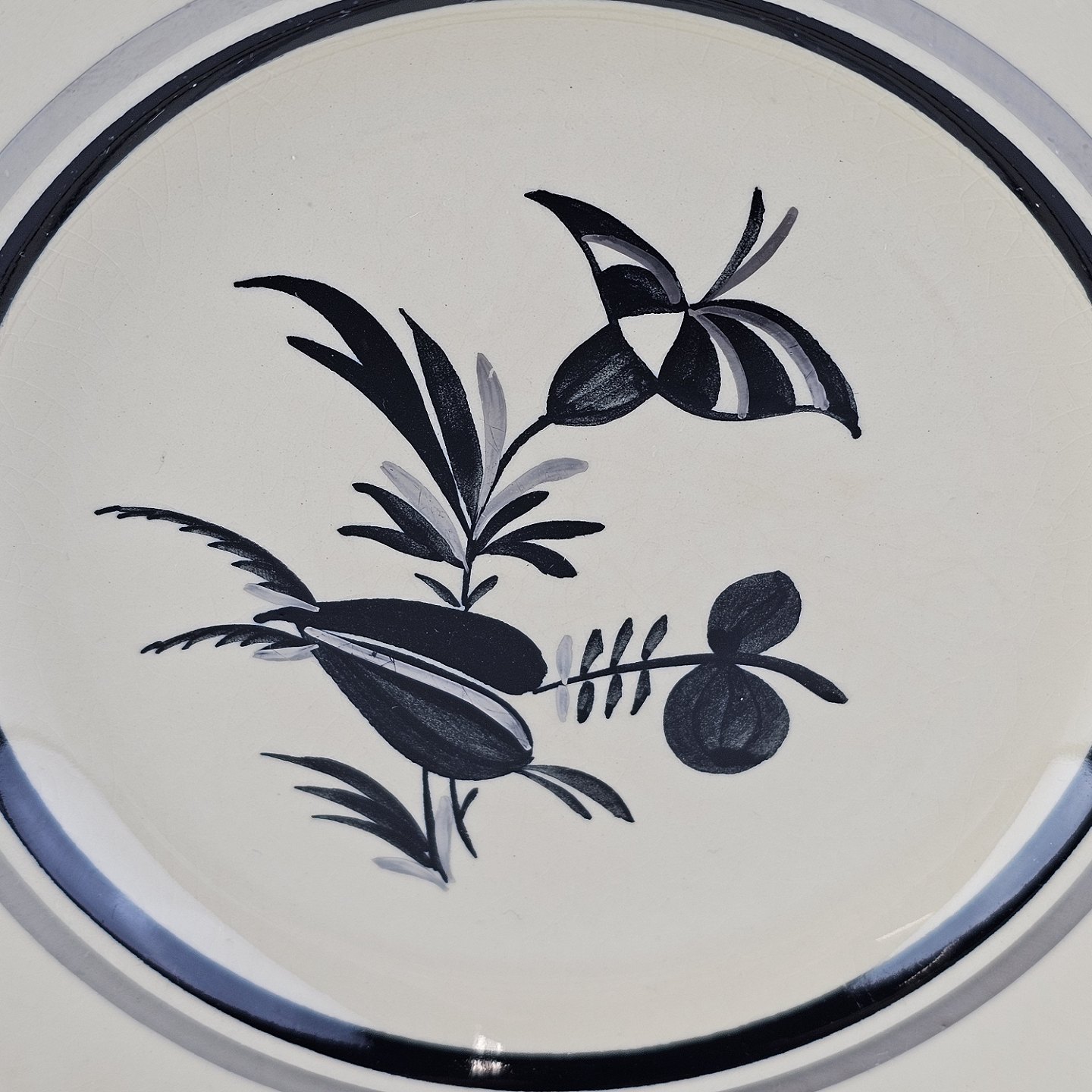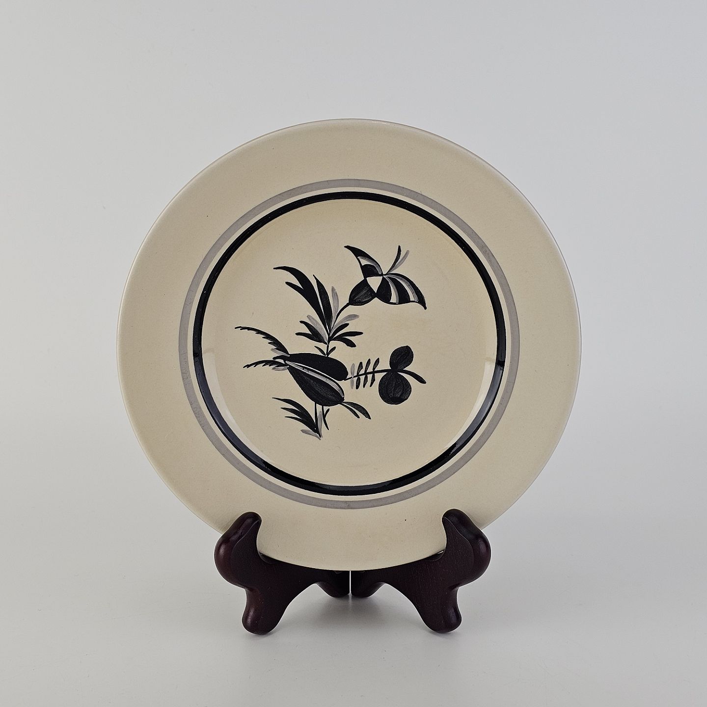 Råhvidt fajancestel i stelform E med dekoration af naturmotiver i sølv og sort farve.