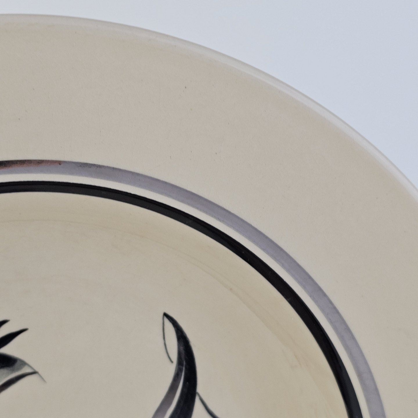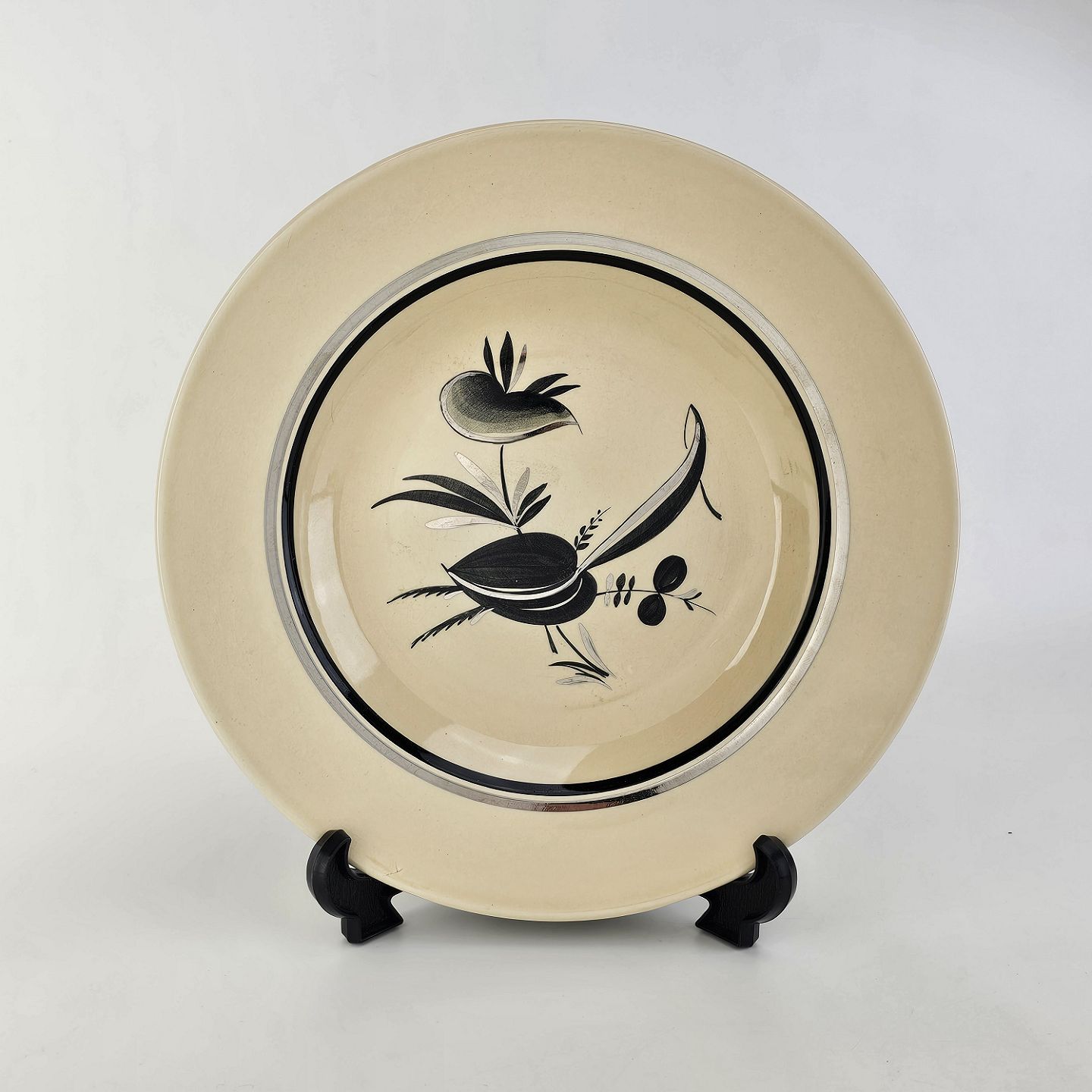 Råhvidt fajancestel i stelform E med dekoration af naturmotiver i sølv og sort farve.
