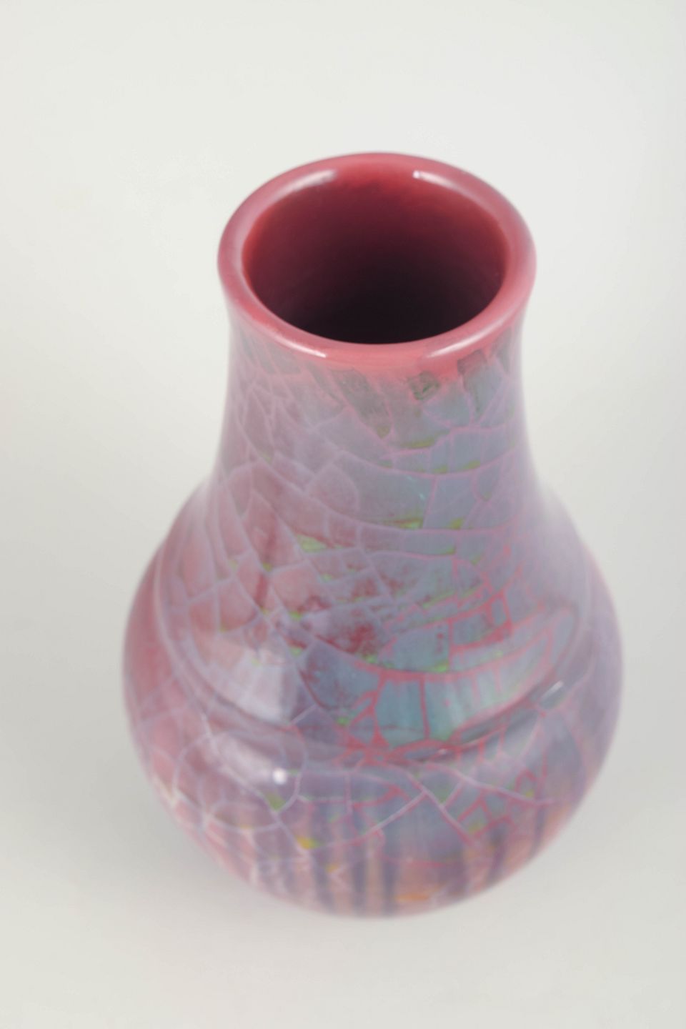 Imponerende balusterformet vase i stentøj med dyb rosa og violet lusterglasur samt dekorativ krakelering, udført i Kählers karakteristiske kunstneriske stil fra slutningen af 1800-tallet.