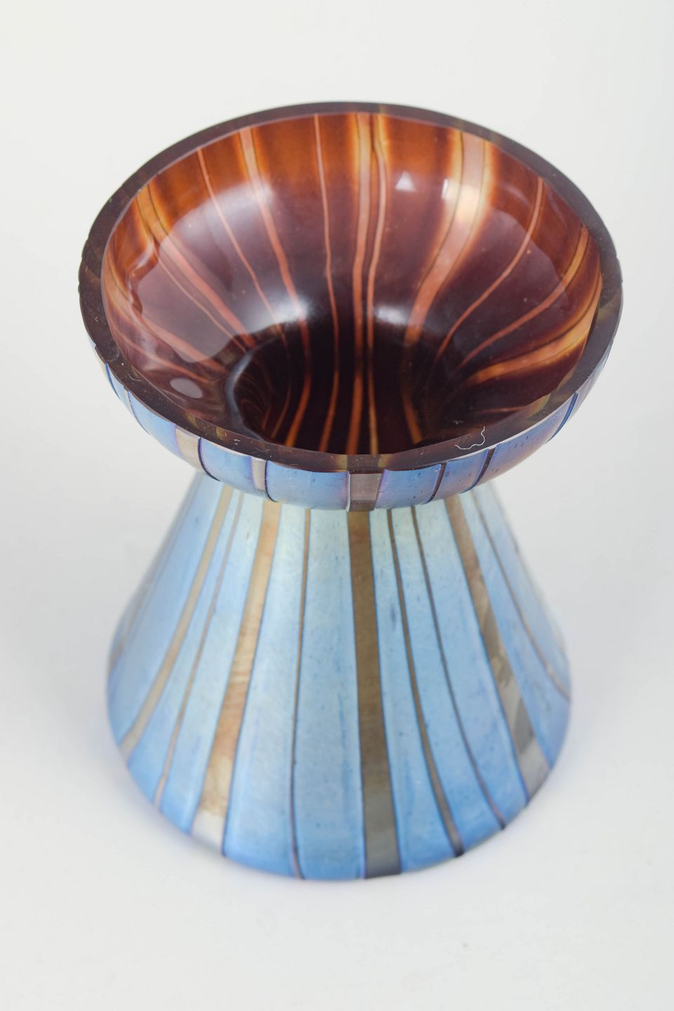 Markant vase i mundblæst glas med kraftig iriserende overflade i blå og kobberfarvede nuancer. Formen er timeglasagtig med bred, tragtformet munding og smallere midterparti. Den lodrette, ribbede struktur og det metalliske farvespil er karakteristisk for Loetz’ produktion i 1920’erne, hvor geometriske og mere stramt artikulerede former afløste den tidligere, mere organiske art nouveau-stil.